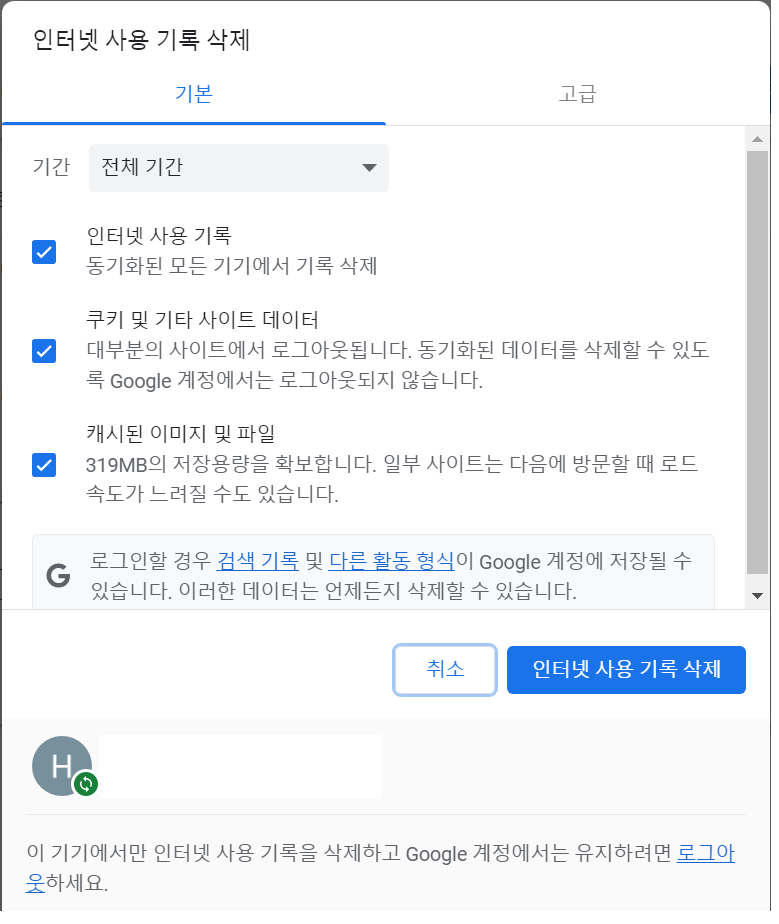 ctrl + shift + delete 누르면 위와 같이 화면이 뜨고 인터넷 사용 기록 삭제룰 눌러주면 사이트가 정상적으로 나온다.