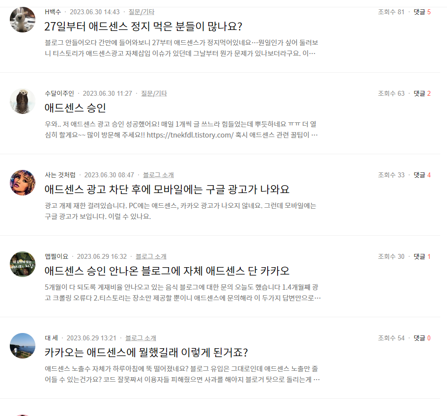 포럼에도 난리다. 애드센스 정지 먹는 사람들 노출이 안되서 수익이 0으로 전환 된사람들