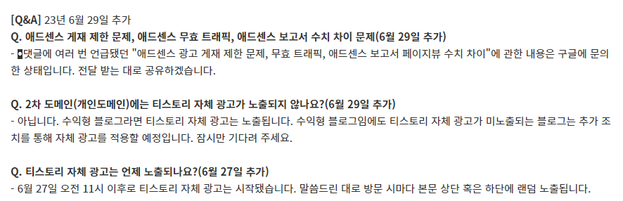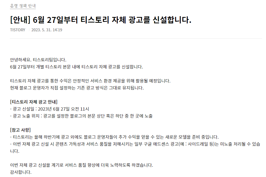 위와 같이 6월 27일부터 티스토리 자체 광고를 신설한다고 한다.
