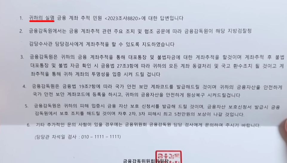 이거 대충 보면 어디서 많이 듣어본 패턴이다. 그렇다 항상 어눌한 말투의 보이스피싱 패턴이다. 최근 이런식으로 우편으로 보내고 담당관 연락처 한테 연락을 하게 하는 방법이라고 한다.