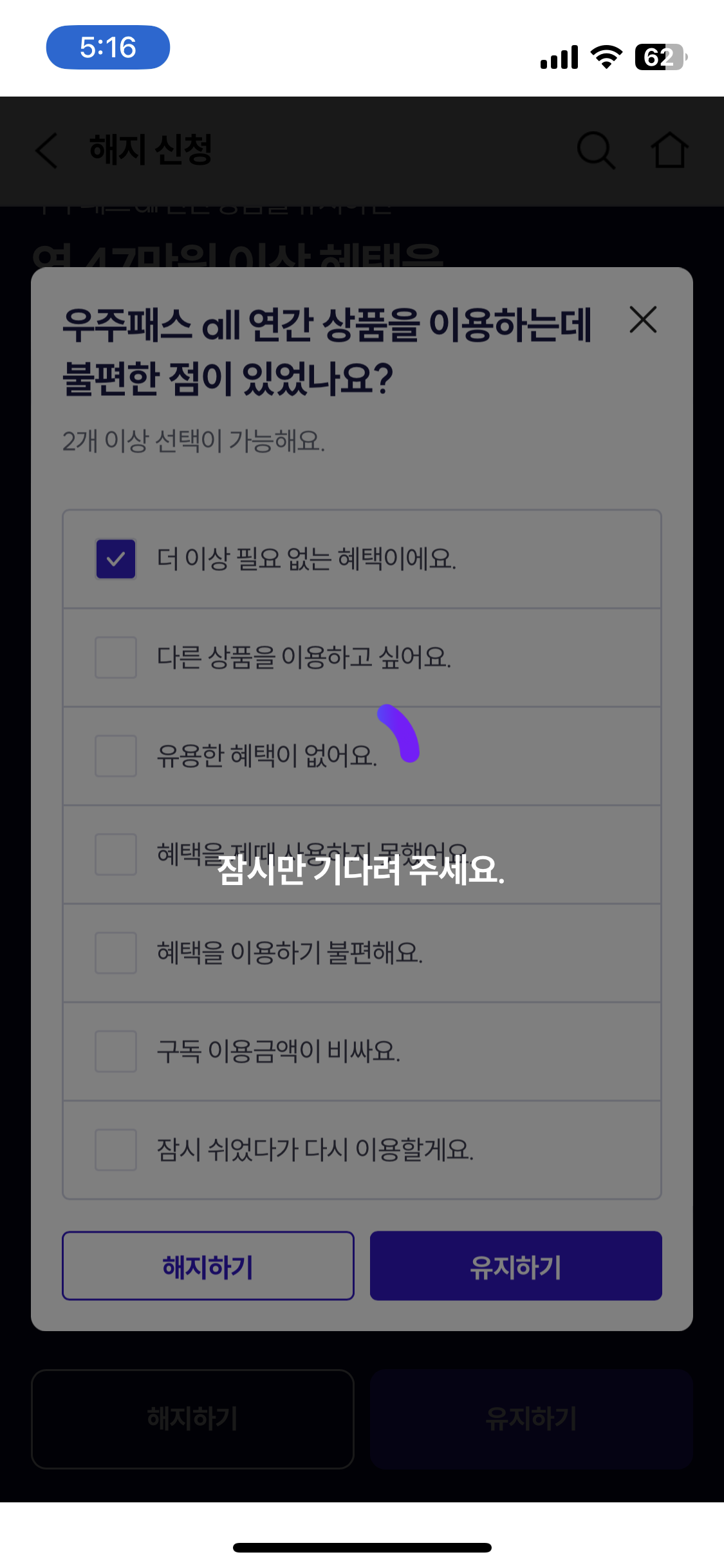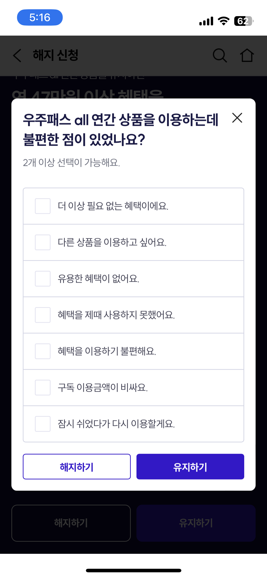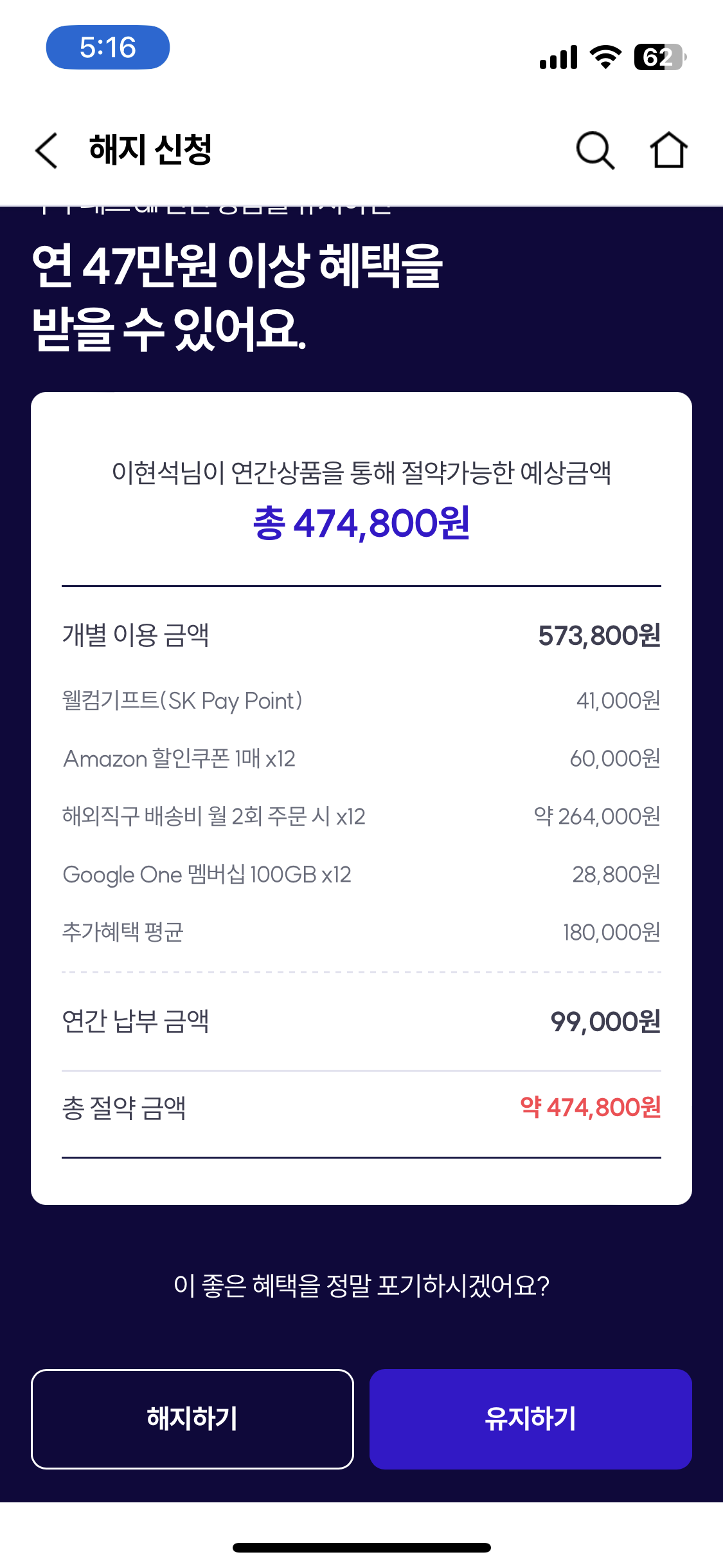 이렇게 많은 혜택이 있다고 한다.. 하지만 난 해지 해지하기 누르면
