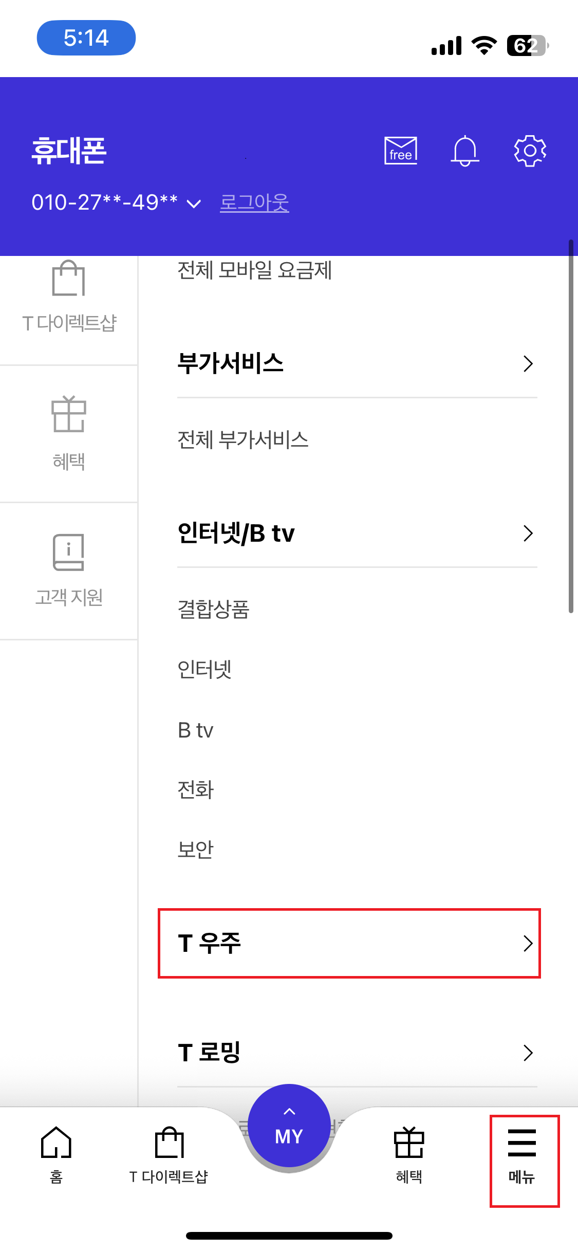 아래 메뉴누르면 왼쪽에 상품서비스가 있다 그걸 누르면 아래로 내리면 T 우주가 있다 이걸 누르자