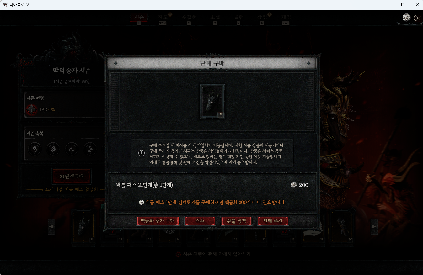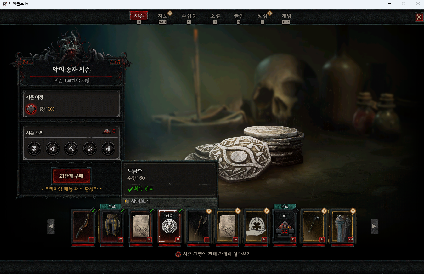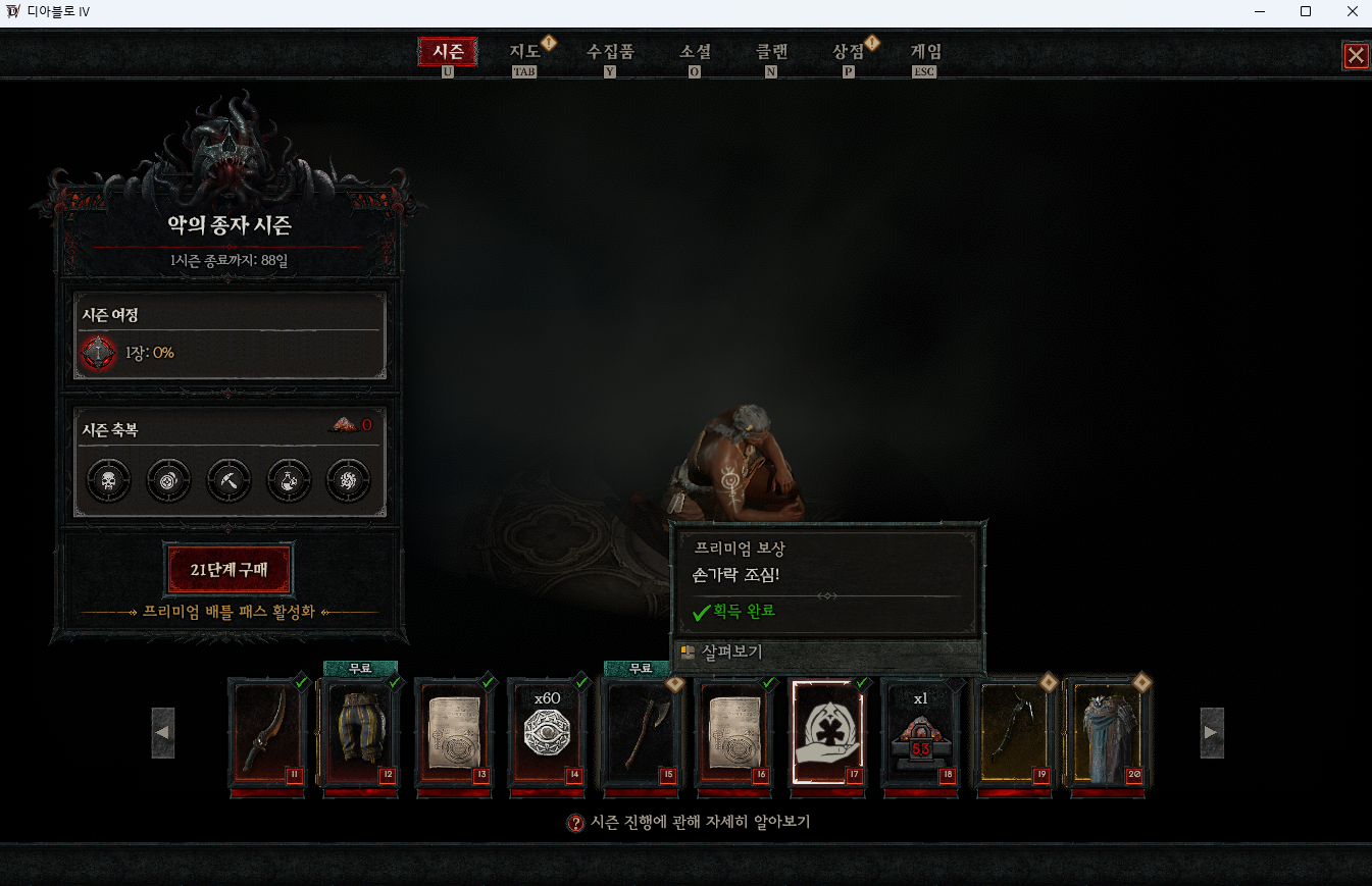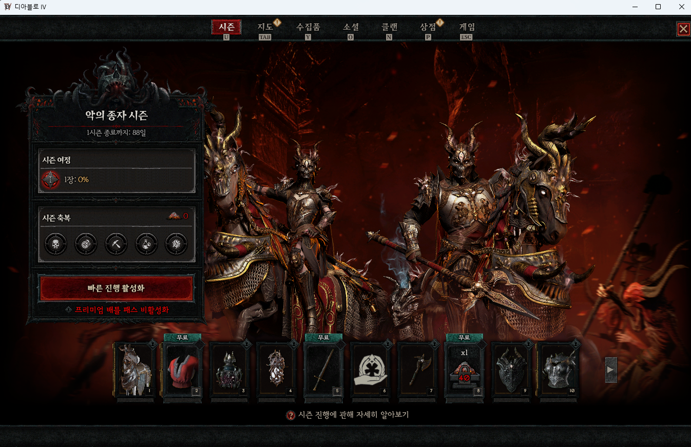 U를 누르면 시즌 여정이 뜨는데 빠른 진행 활성화(배틀패스) 을 누르면 배틀패스가 진행 된다. 디아블로4 얼티밋에디션 산사람들은 활성화를 눌르자