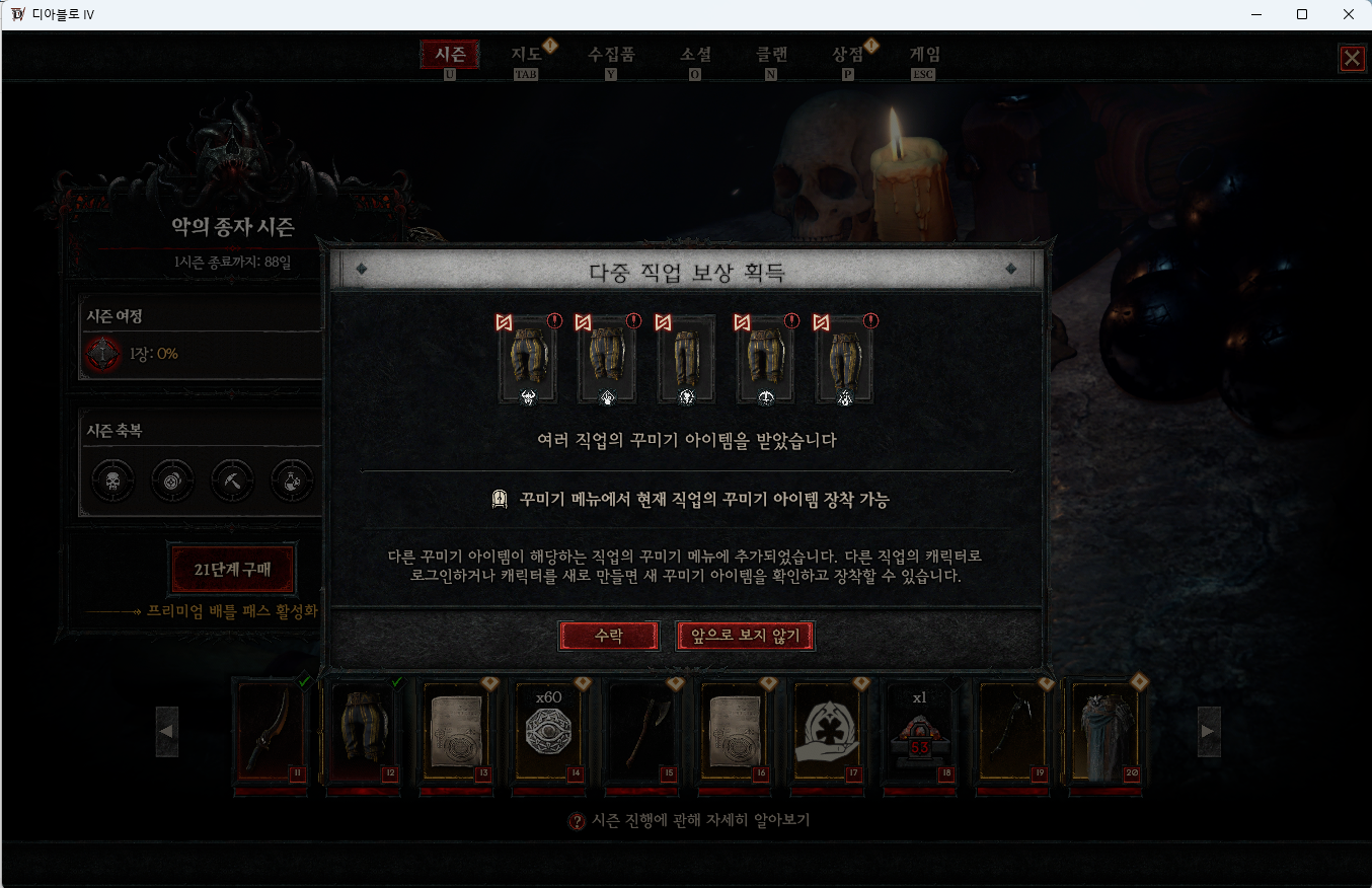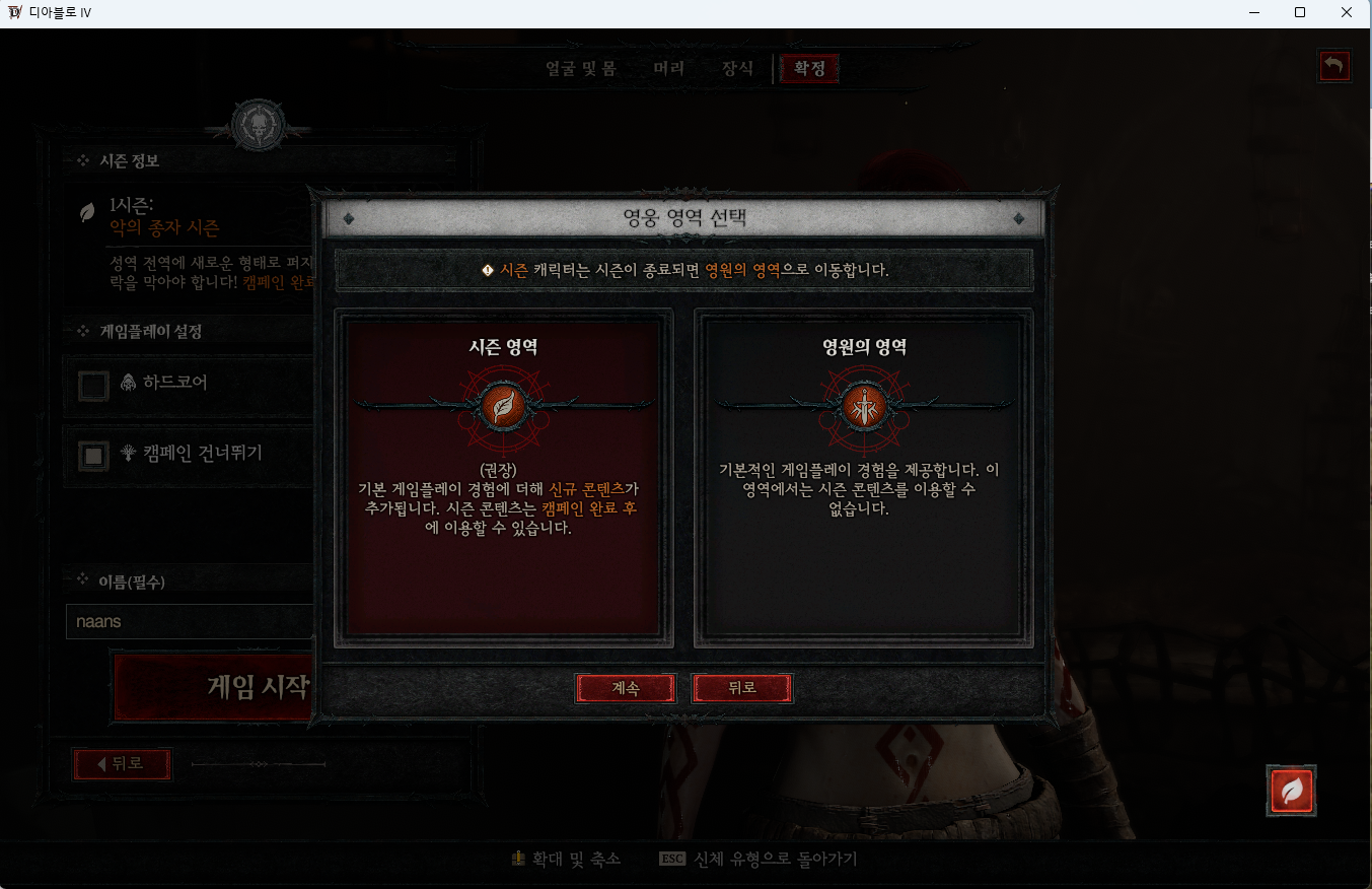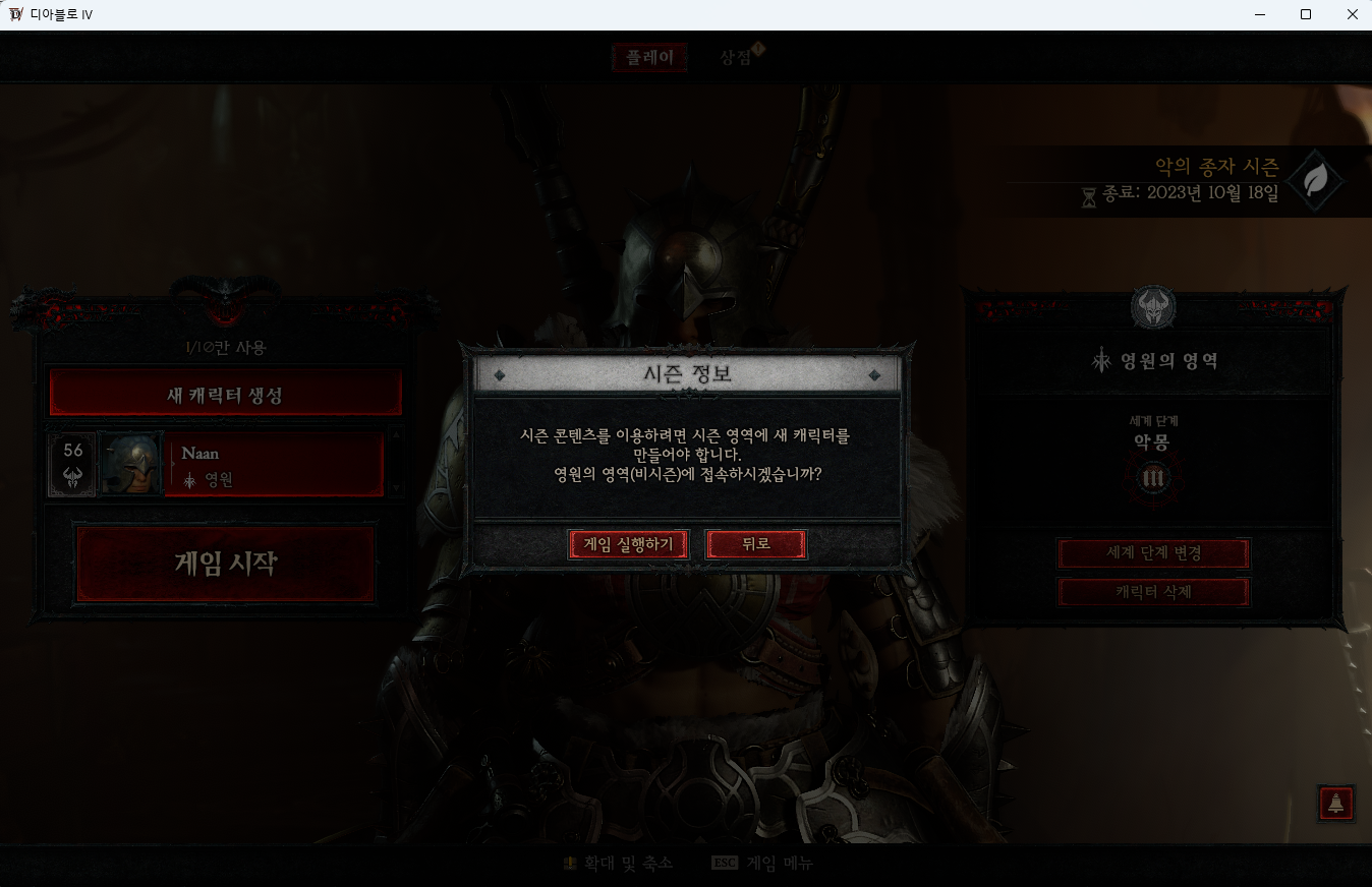 시즌 콘텐츠를 이용하려면 시즌 영영에 새 캐릭터를 만들어야 한다고 하는데 그냥 게임 실행하기를 눌렀다.
