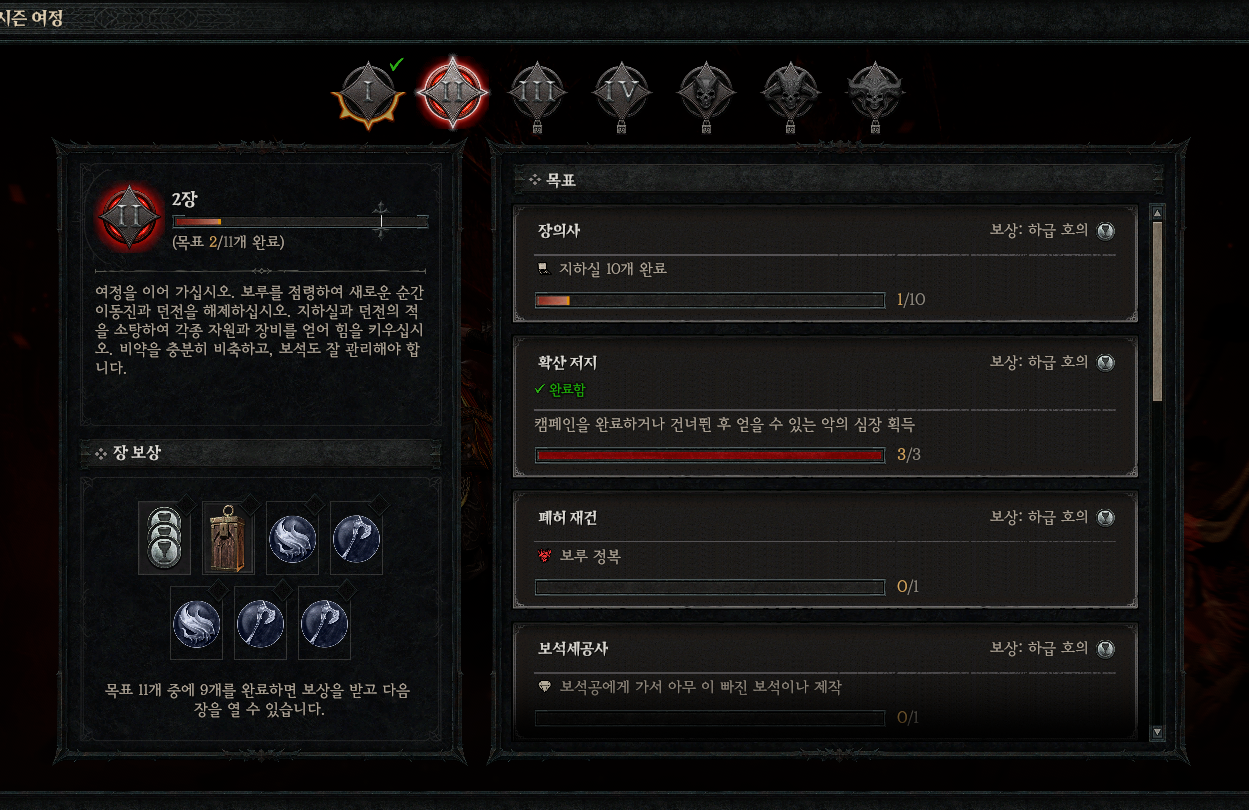 시즌 여정은 모두다 완료해야 다음으로 넘어가는게 아니고 최소 요구갯수가 있다 이것만 완료하면 다음장으로 넘어갈수 있으니 굳이 어려운건 패스해도 장 보상을 받을 수 있다.