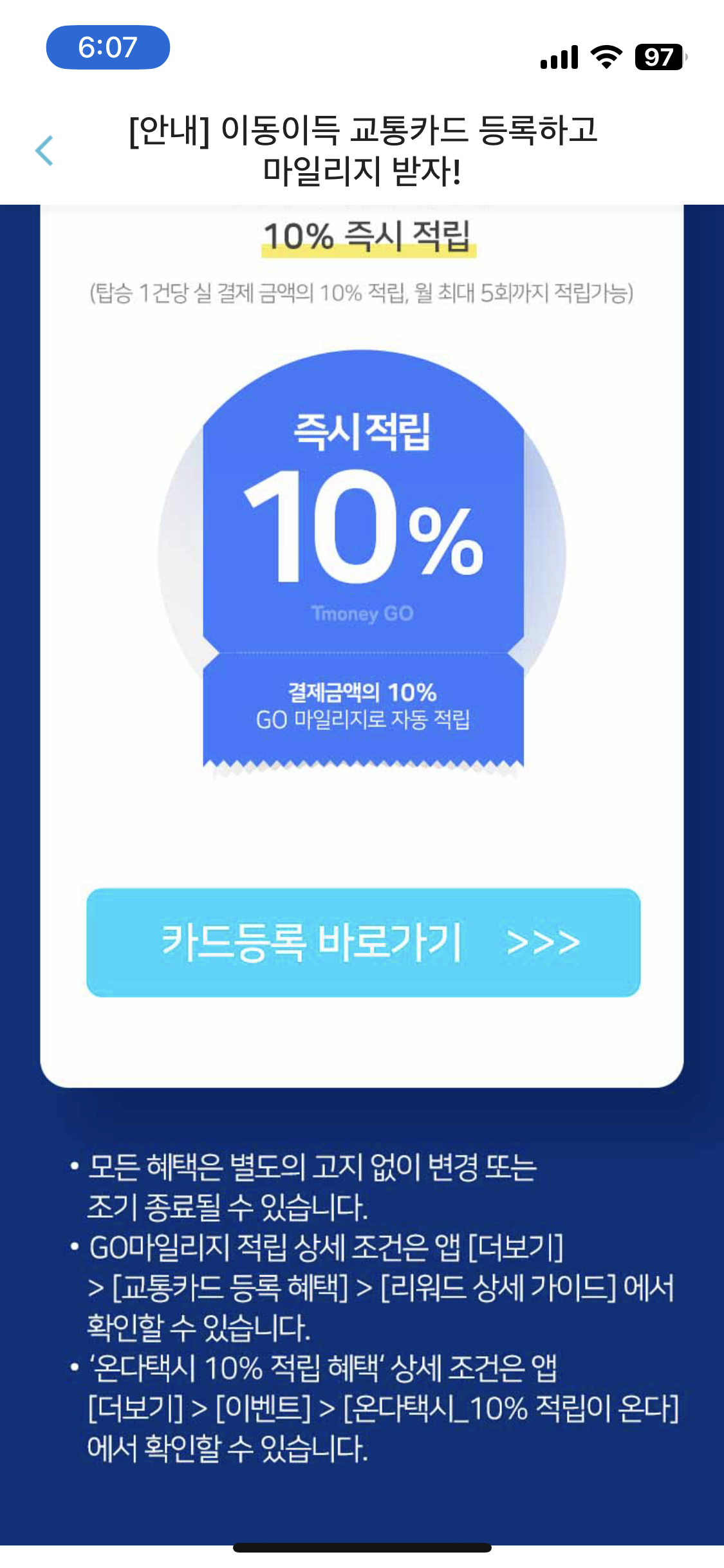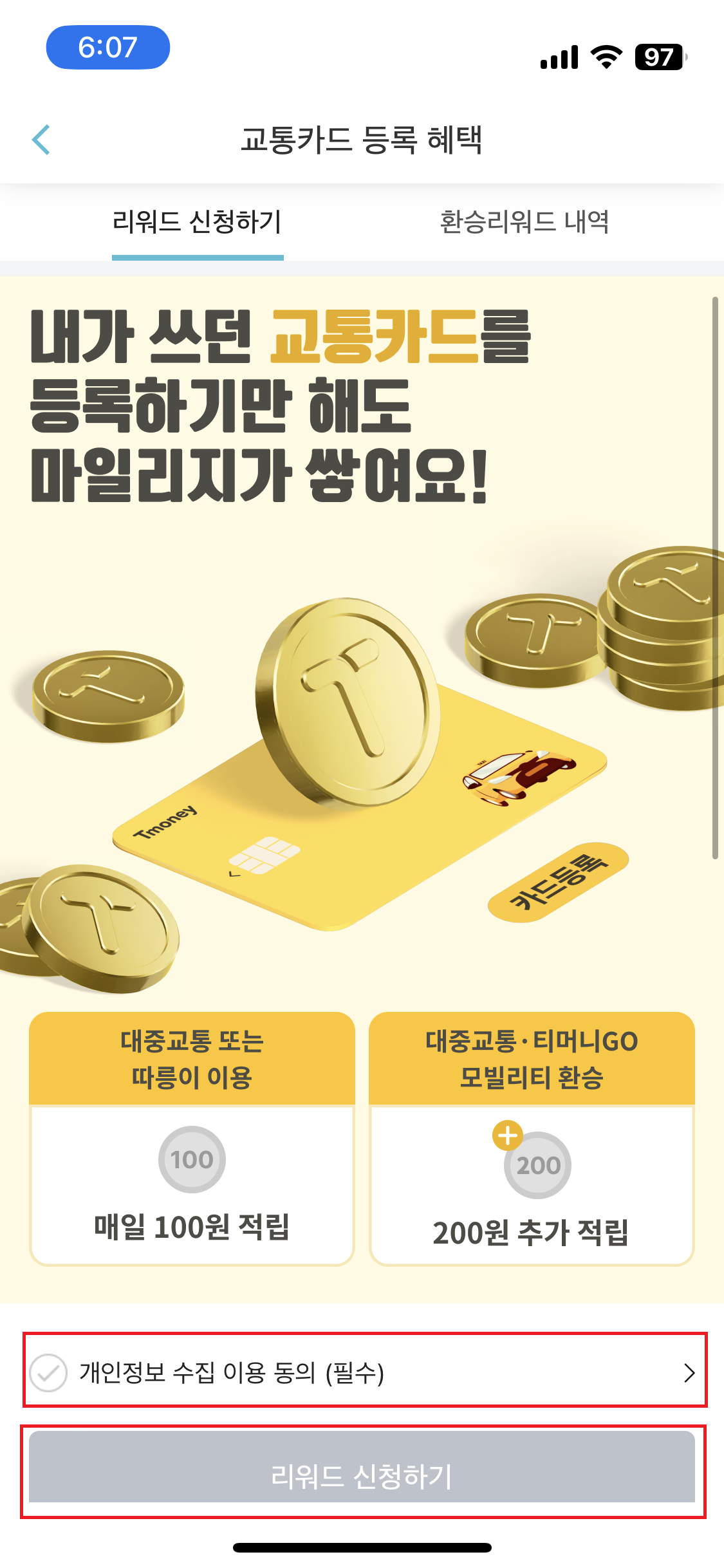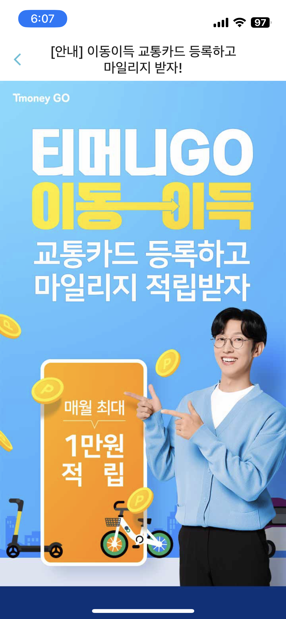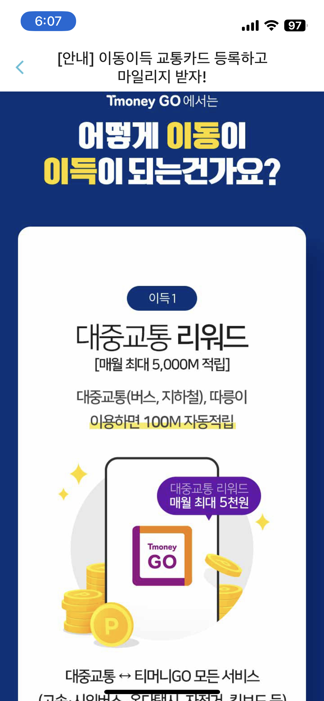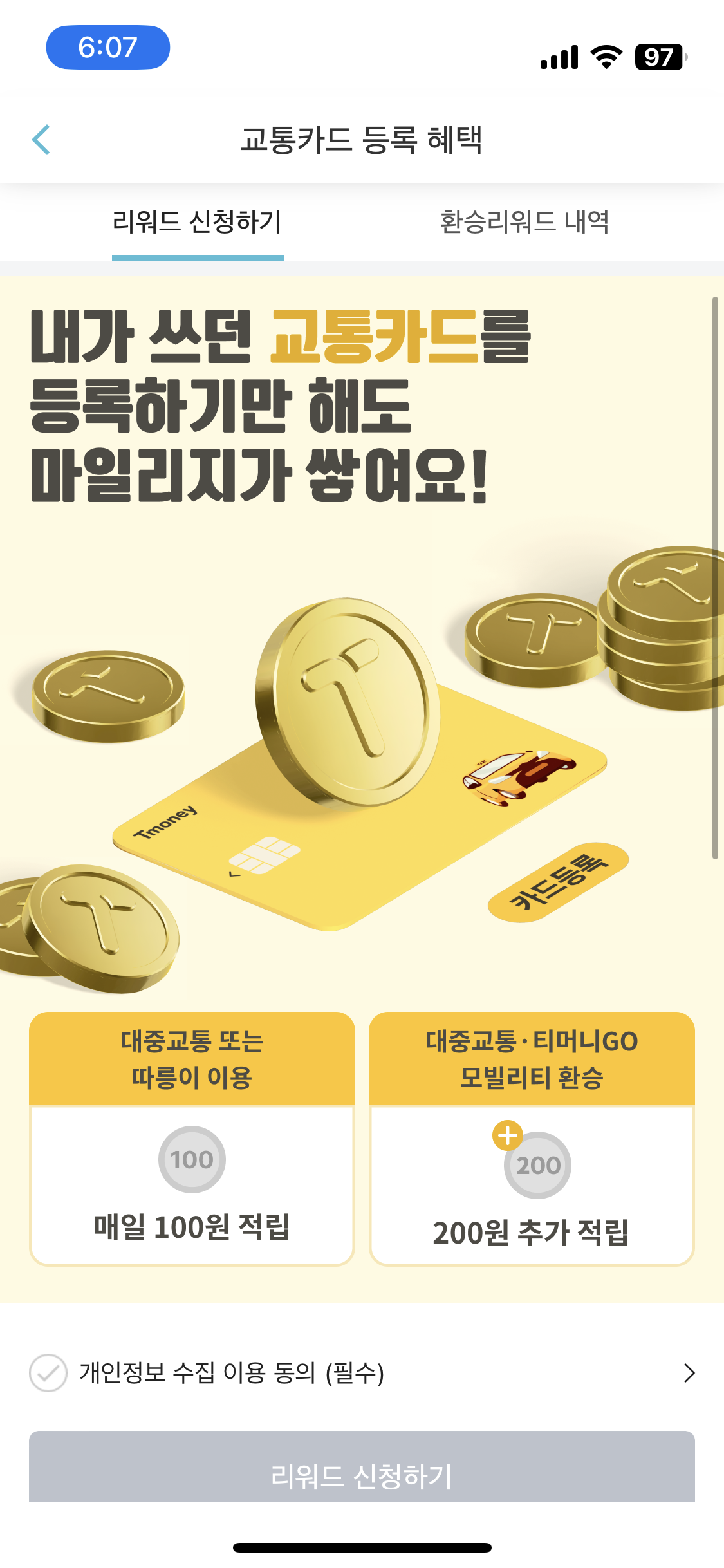 티머니GO 를 설치하고 등록만 해두면 한달에 최대 1만원 적립이 된다.