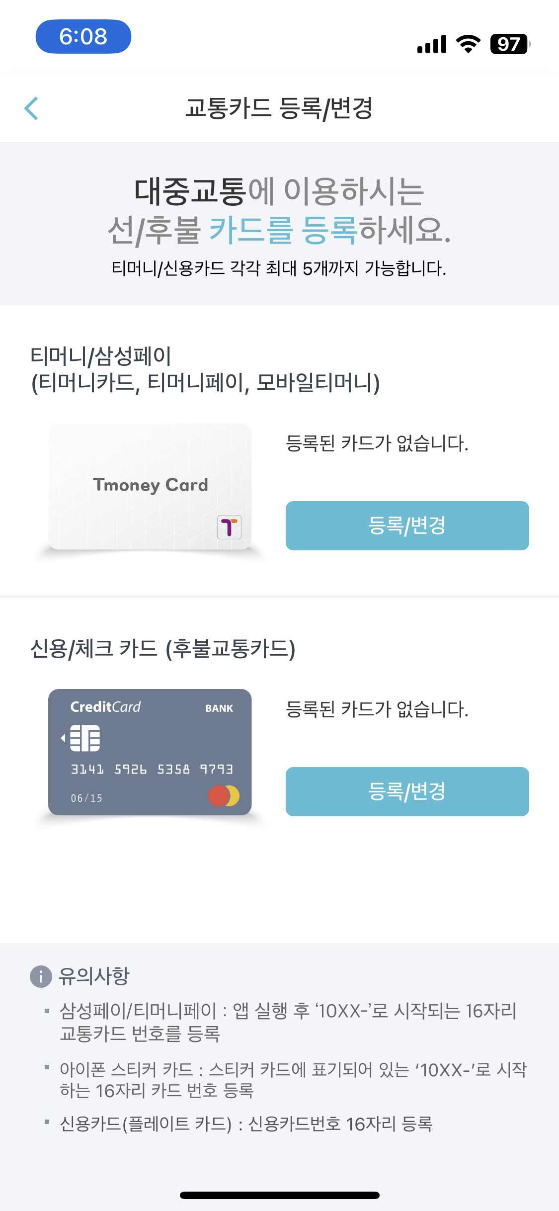 티머니/삼성페이 or 신용/체크 카드 등록을 할 수 있다. 자신이 가지고 있고 주로 이용하는 교통카드를 등록을 하자