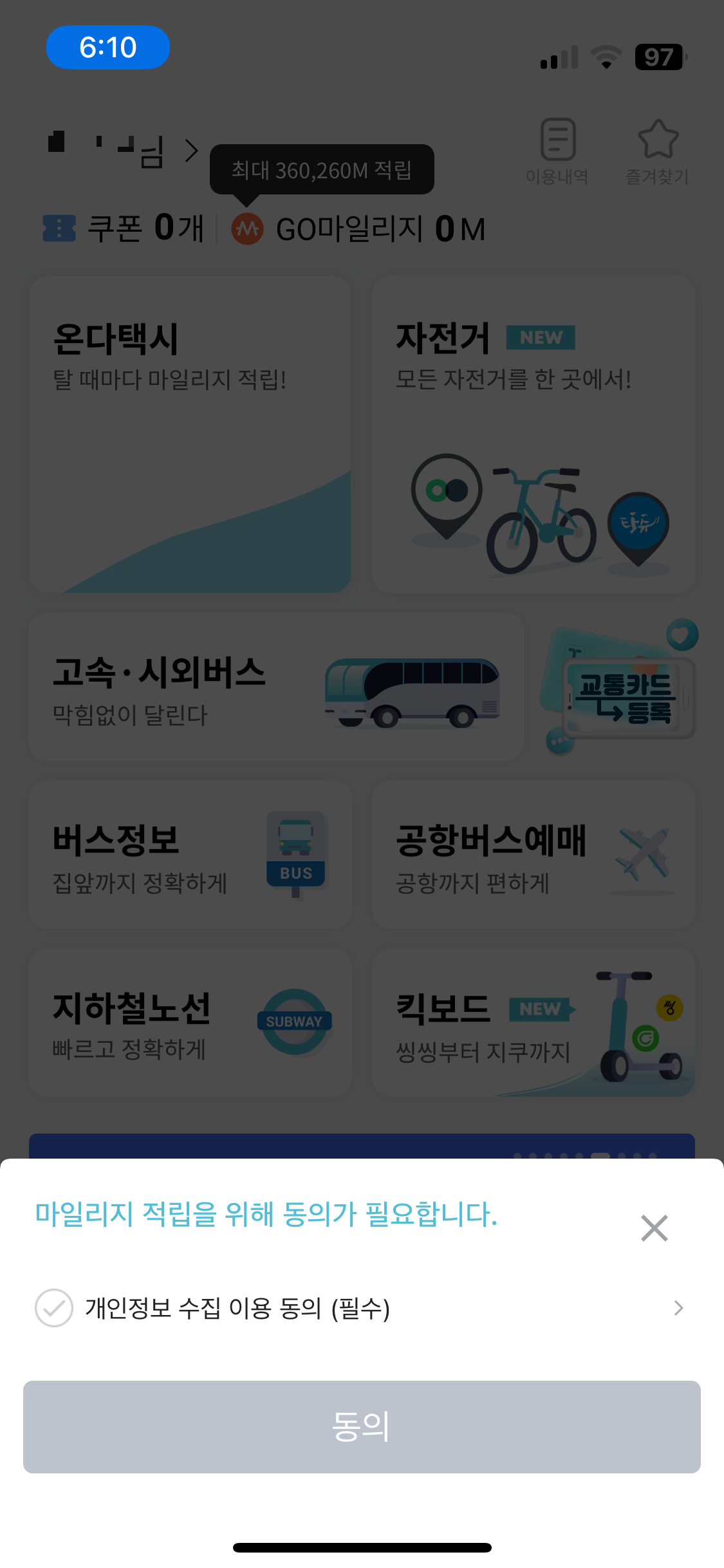 설명에 되있는것처럼 한달에 최대 1만원 적립을 하려면 대중교통 에서 고속,시외버스 or 오다 택시 or 자전거 or 킥보드 등으로 계속 환승을 해야 최대 1만원까지 받을 수 있다.