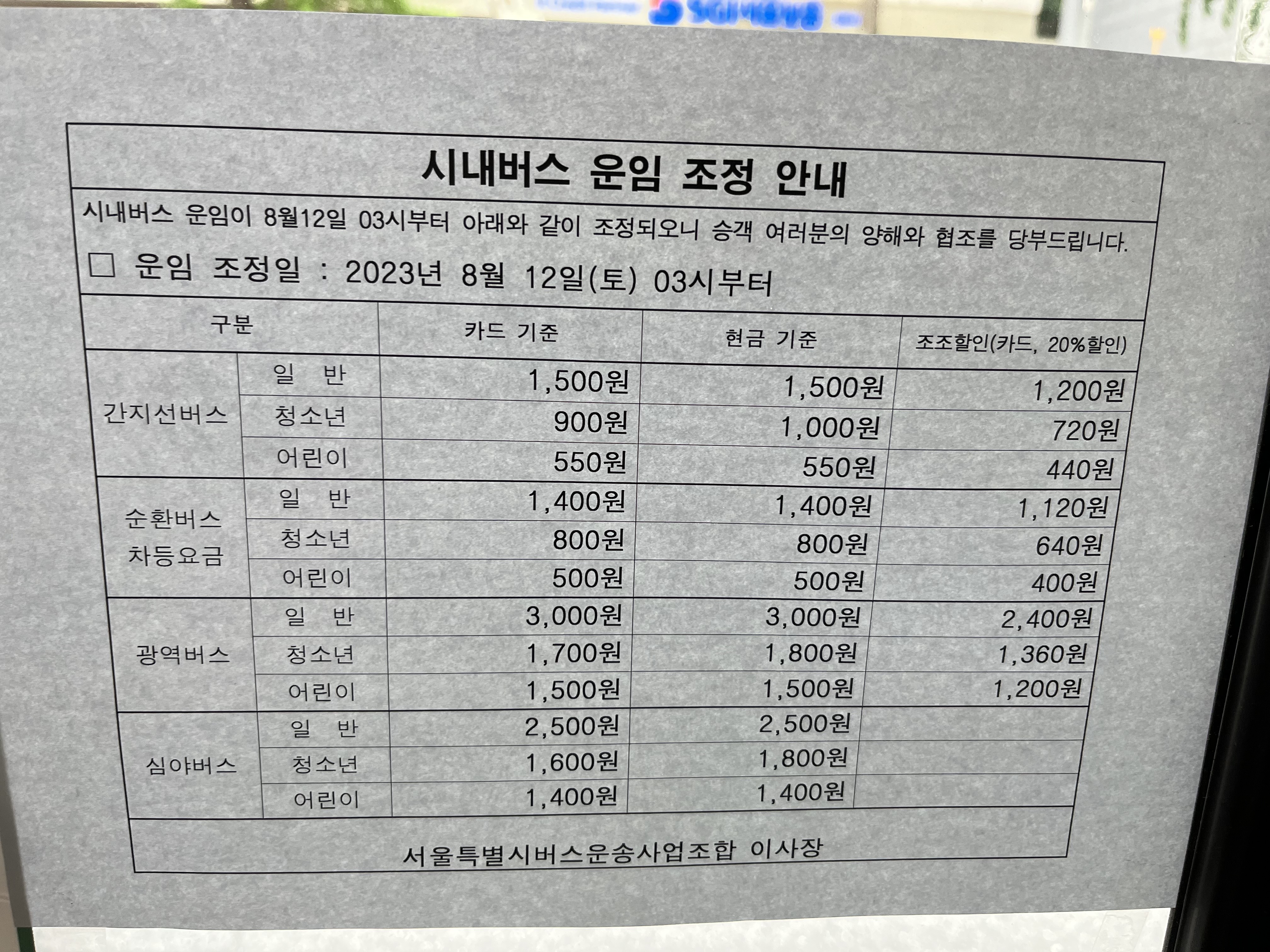 서울 시내버스 운임 요금 조정(2023년 8월 12일 부터 시행)