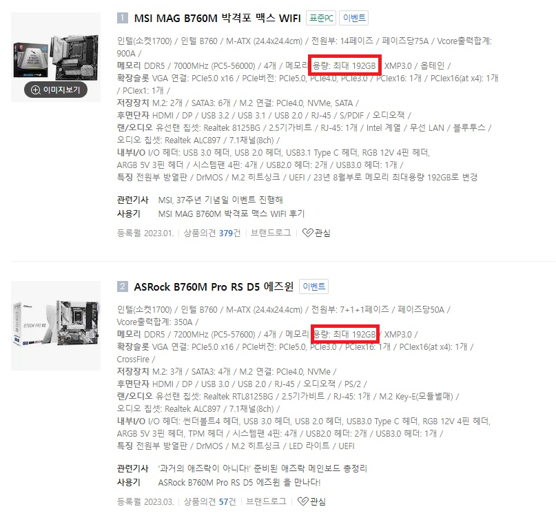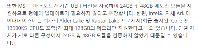 CORSAIR VENGEANCE RGB DDR5 RAM 96GB (2x48GB) DDR5 5200 구매 후기 https://algo79.tistory.com/1505 서버가 아닌 일반 데스크탑 메모리 192GB 지원..? 어느날 보드를 확인 1700 지원 보드가 192GB 지원 한다고 적혀 있다. 모