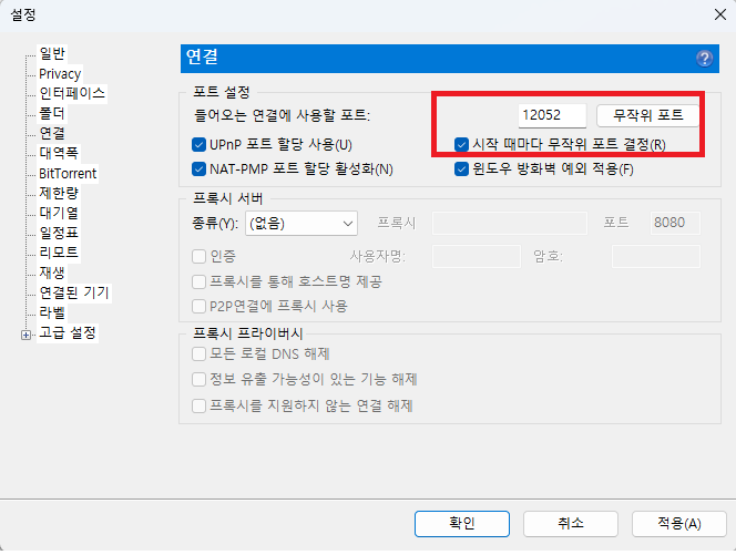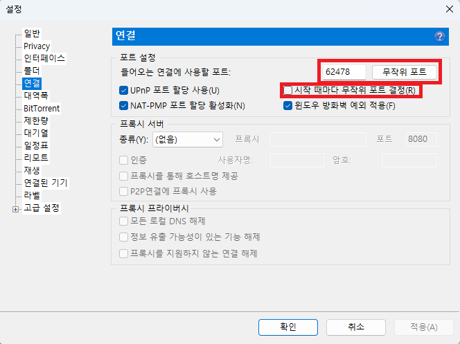 torrent - 옵션 - 설정 - 연결