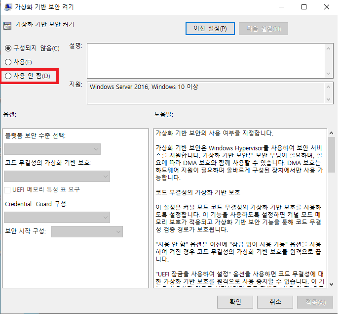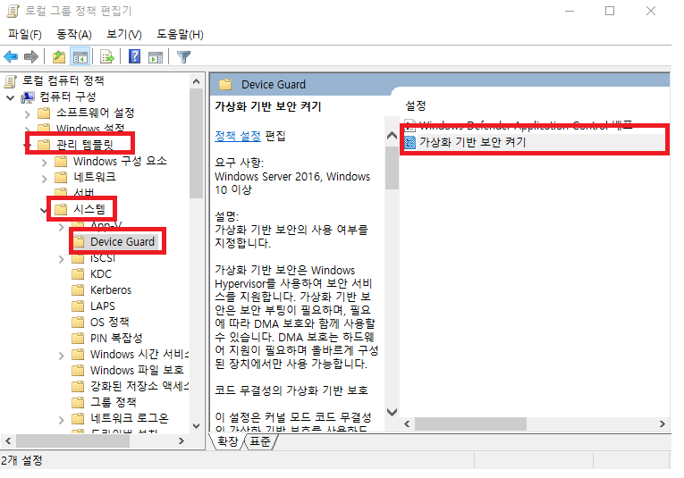관리 템플릿 - 시스템 - Device Guard - 가상화 기반 보안 켜기 클릭