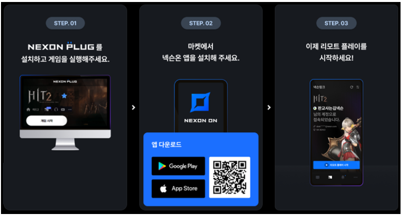 사용방법은 간단하다. 넥슨플러그 런처로 게임을 실행하고 앱을 다운 받아서 로그인 그리고 원격접속으로 게임 시작