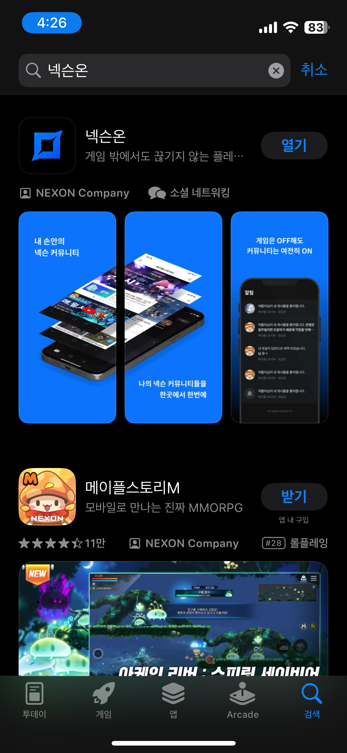 넥슨온으로 검색이 안나오면 위 QR코드로 찍어서 다운로드 하자