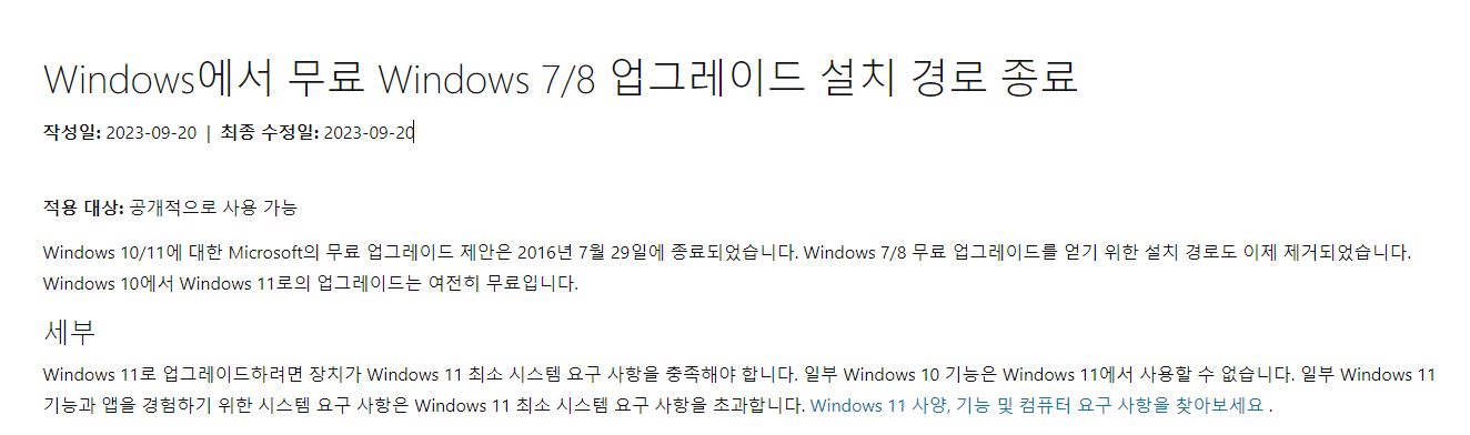 위 내용으로보면 알수 있듯이 윈도우 7/8 윈도우 시디키로 윈도우11 설치가 더이상 지원이 안된다는 내용이다.