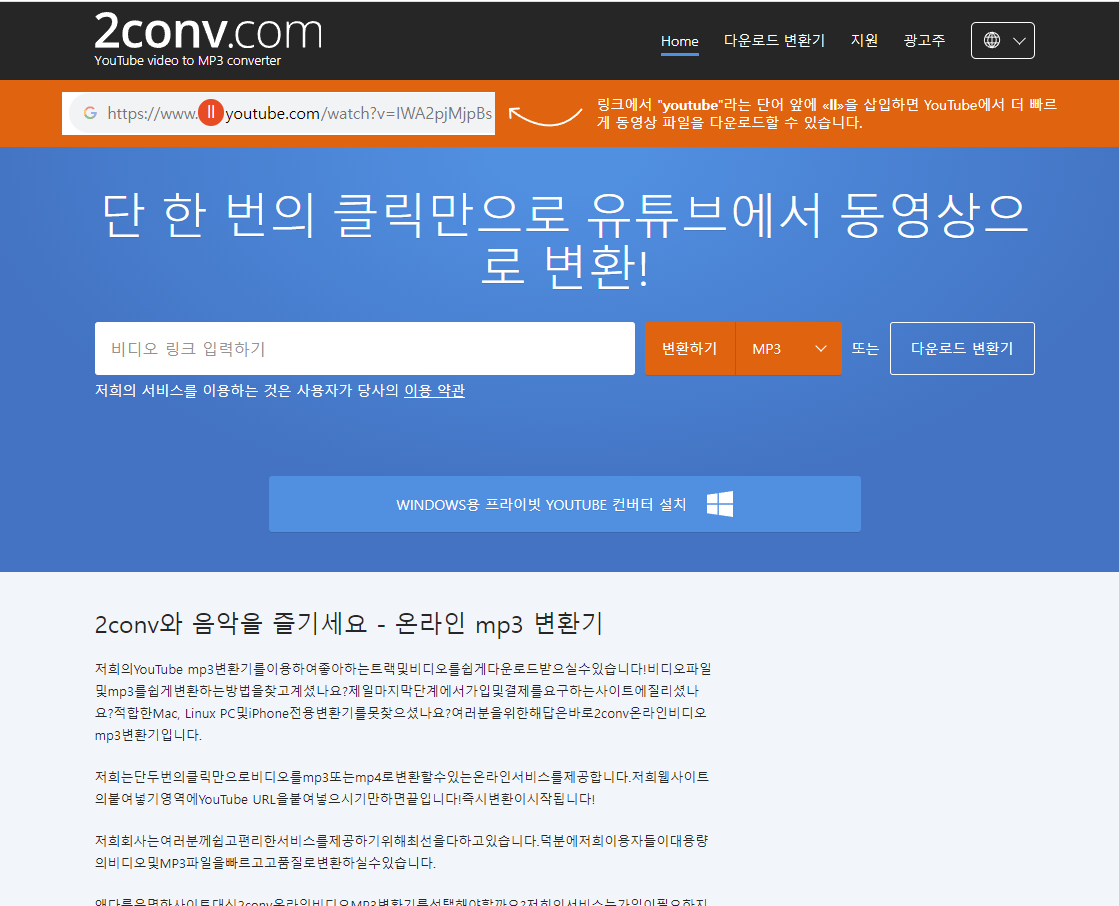 유튜브 URL 주소를 넣고 포멧 선택 후 변환하기 누르면