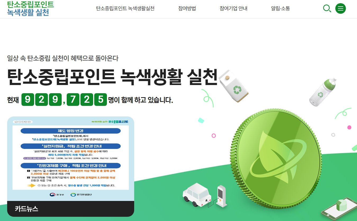 일상 속 탄소중립 실천이 혜택으로 돌아온다 탄소중립포인트 녹색생활 실천 현재 929725명이 함께 하고 있습니다.