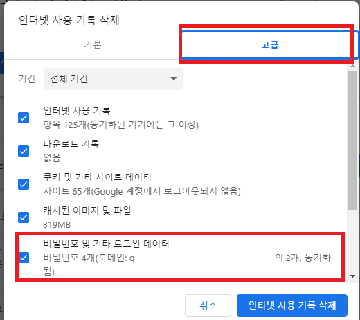 고급으로 되어 있는거 모르고 인터넷 사용 기록 삭제를 잘못 눌러버렸다.