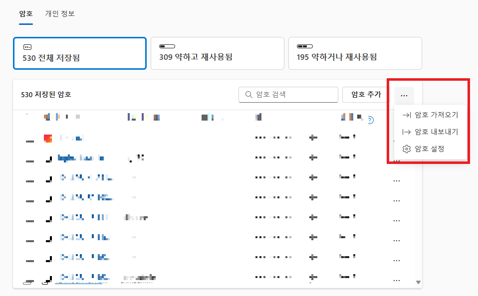 비밀 번호를 정상적으로 가져왔다. 크롬에서 쓰던 암호를 100프로 완벽하게 가져오진 않았지만 그래도 예전에 쓰던 모든 암호를 정상적으로 가져왔다