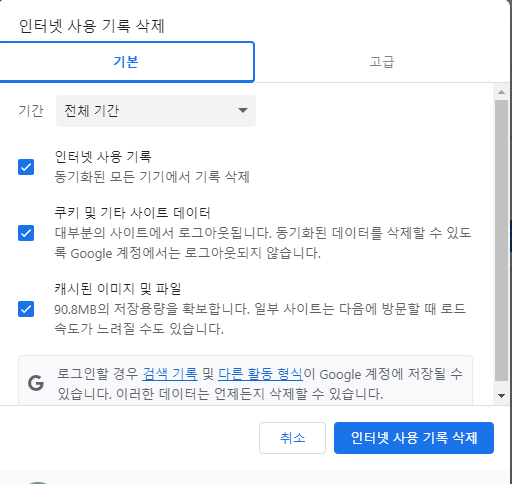 고급으로 되어 있는거 모르고 인터넷 사용 기록 삭제를 잘못 눌러버렸다.