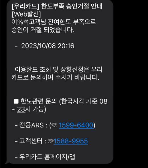 우리체크 카드로 결제를 했는데 위와 같이 한도 초가로 결제가 안된다.