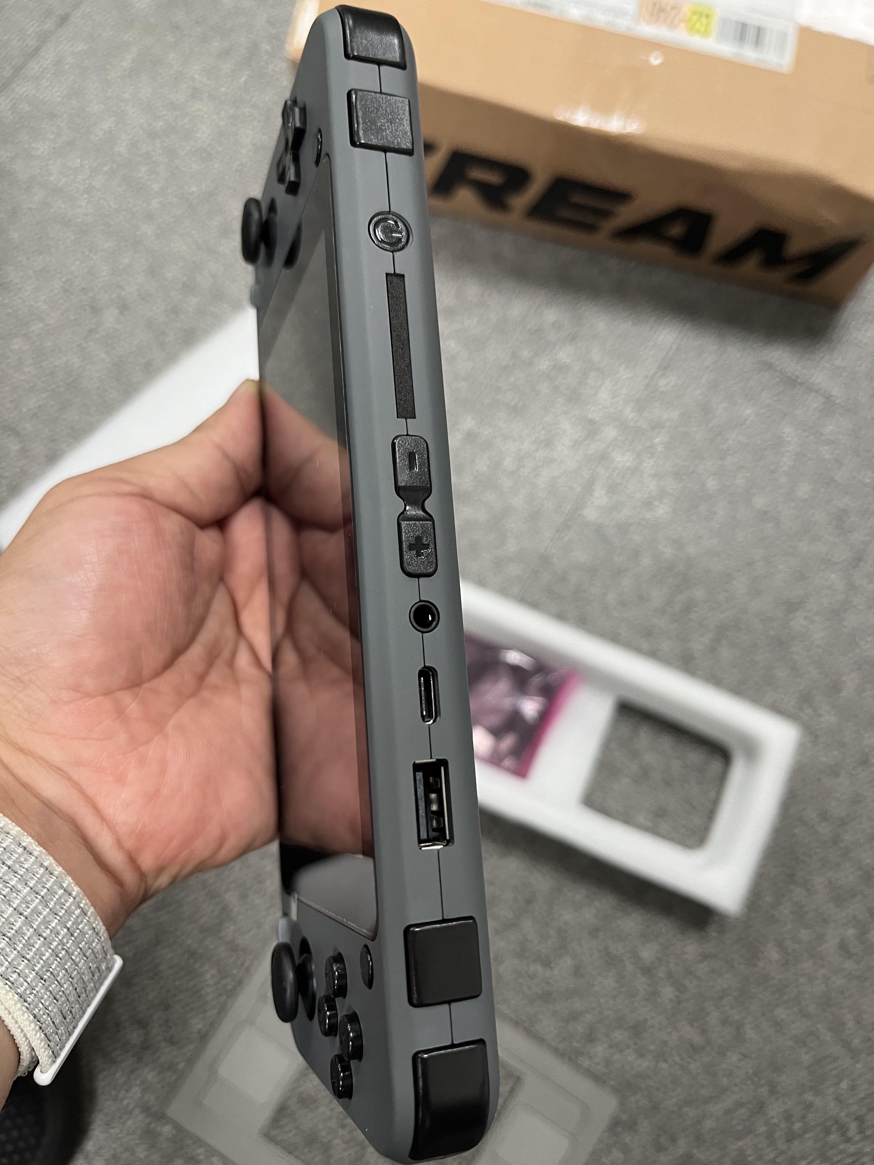 상판에 L1,L2 ,R1,R2 버튼과 볼륨키 전원키, C타입과 USB 단자, 3.5이어폰 짹 이 있다.