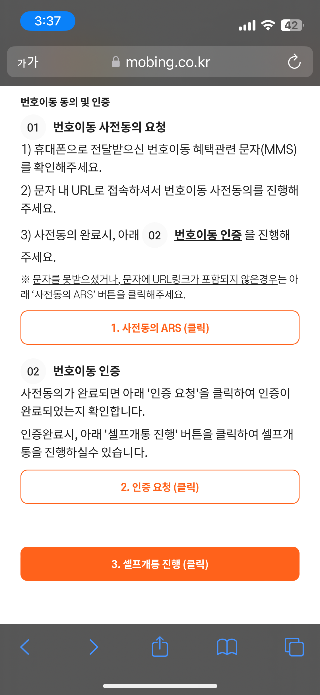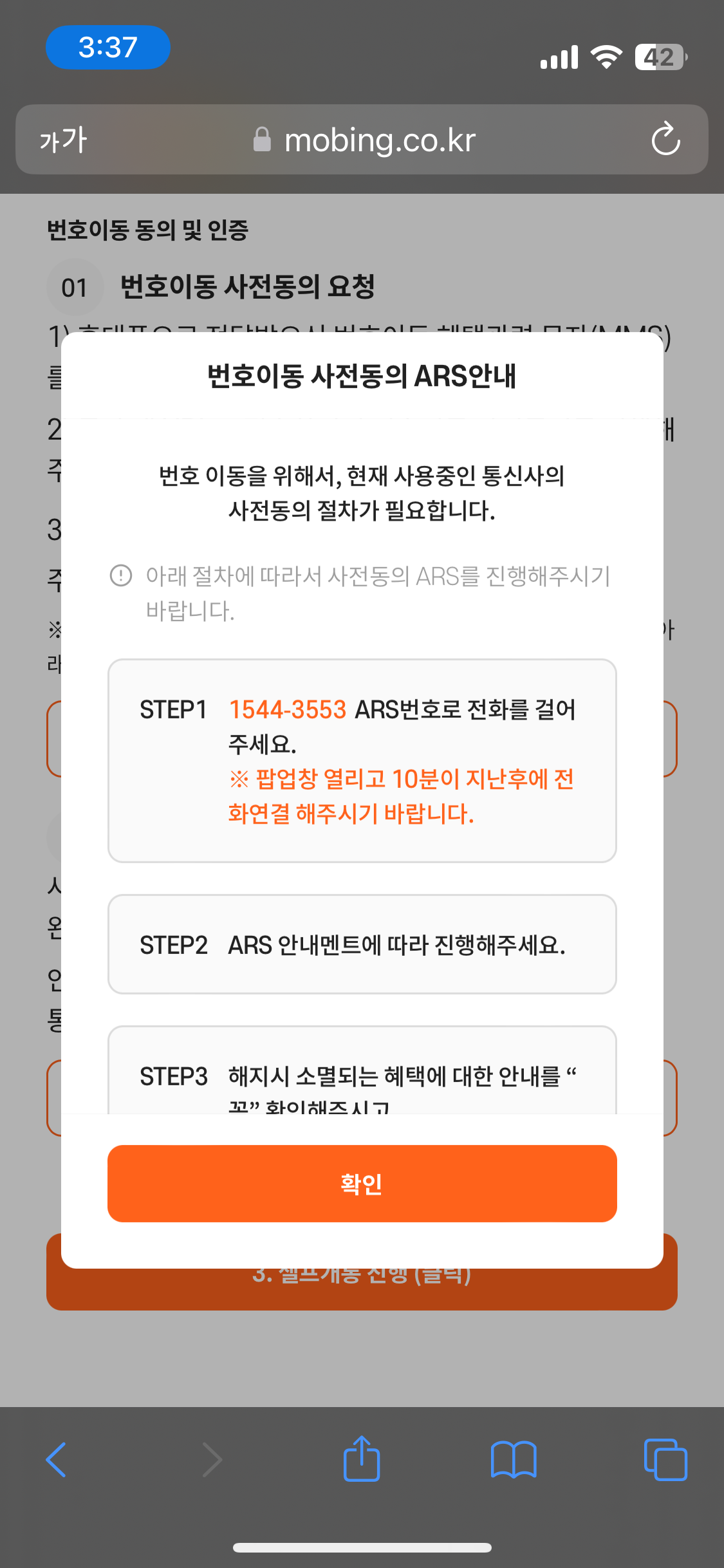 혹시나 해서 모빙 고객센터.. 약 10분 정도 대기해서 전화를 해봤는데 전산이 늦어서 그럴수 있다고 한다. 기다리면 사전동의 문자가 가고 동의 하면 바로 개통이 진행 된다고 한다.