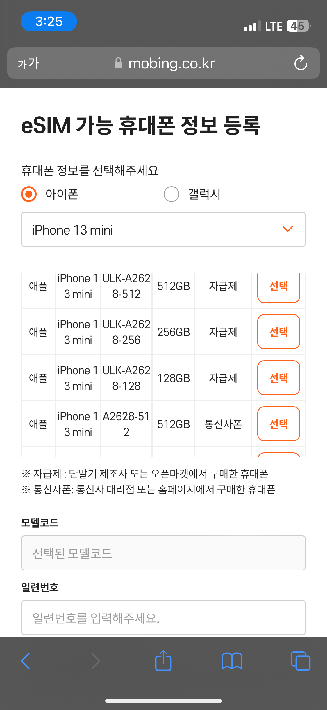 그러면 자신의 폰 모델을 선택하고 일련번호를 입력 하면 된다.