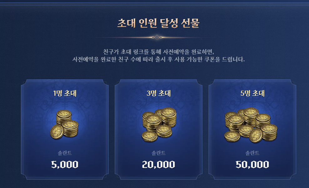 1명 초대시 5,000솔란트, 3명 초대는 20,000솔란트, 5명 초대는 50,000 솔란트를 받게 된다.