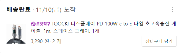100W 도 특이하지만 케이블에 충전W 를 표시해준다. 6일날 구매를 했고 10일날 도착했다. 쿠팡로켓직구 요즘 자주 이용하는데 좋은듯 하다.