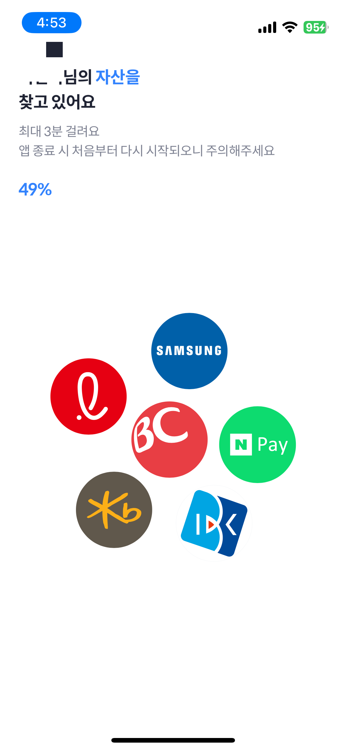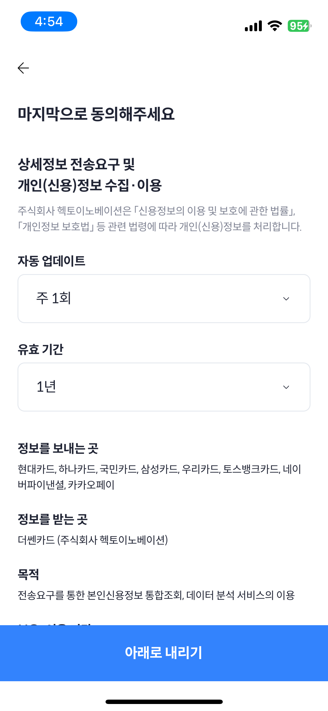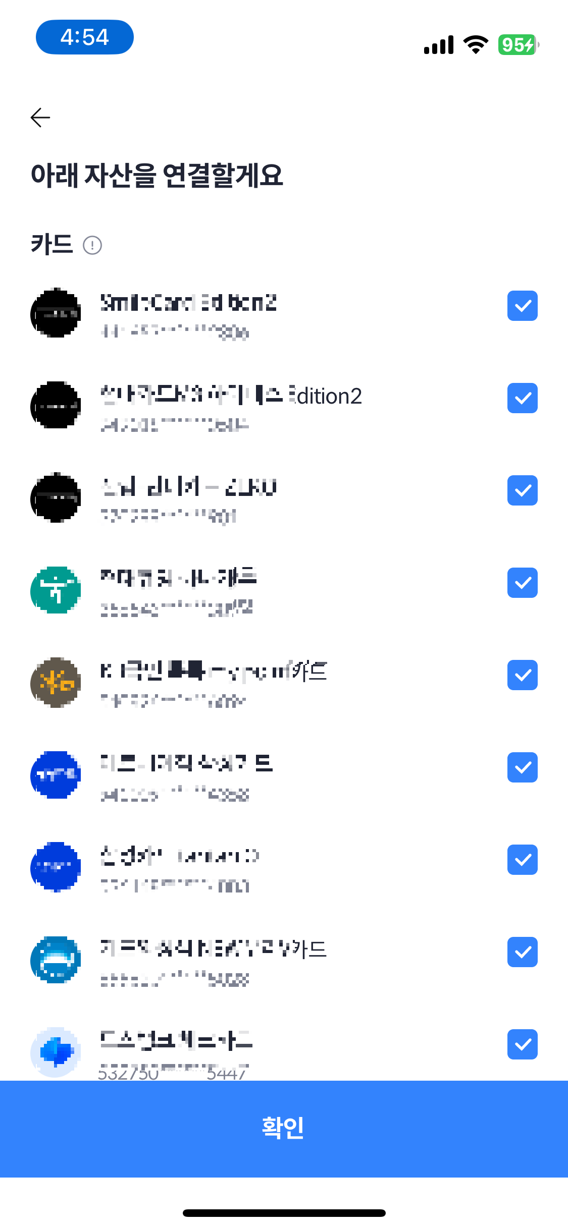 자산연결을 할건지 뜬다 내 정보로 연결된 카드 정보를 다 끌어 오는듯 하다. 하고 싶은 카드만 선택 하고 확인을 누르자.