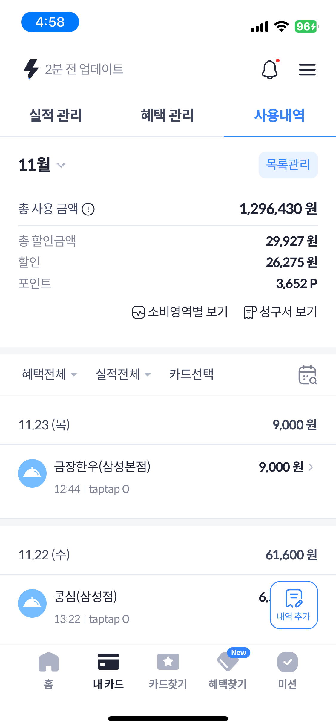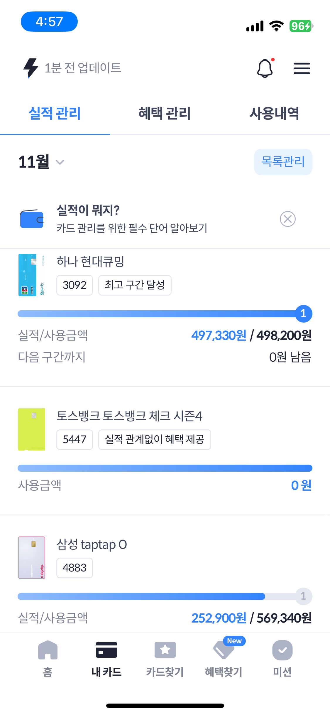 실적 관리도 한눈에 볼 수 있다. 카드사마다 들어가서 내 실적이 채워졌나 확인 안해도 된다.