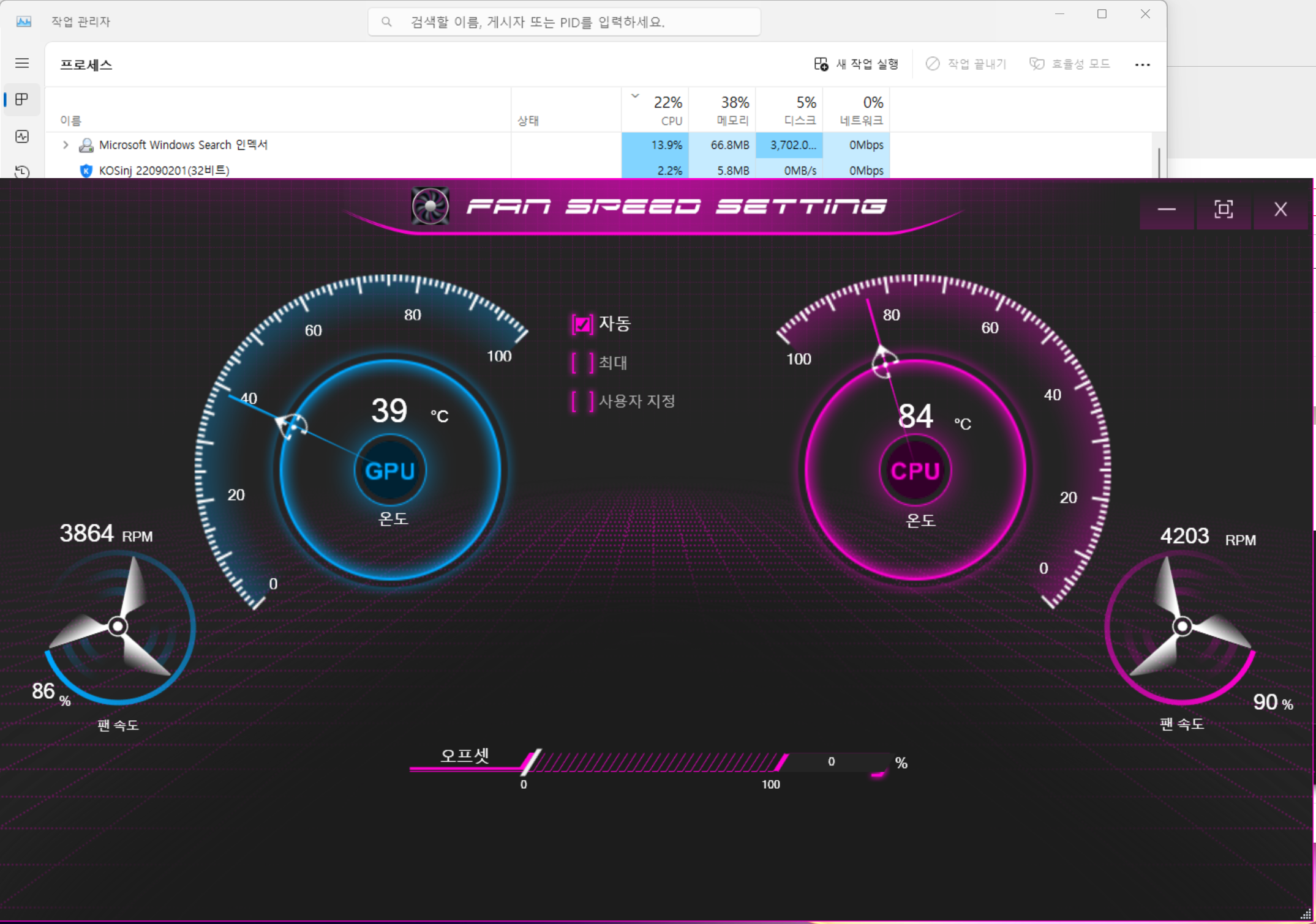 Fan Speed Control 에 들어가니 온도가 미친듯이 높다 84... CPU 사용율도 별로 안높은데.. GPU도 거의