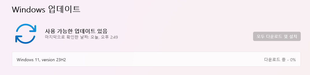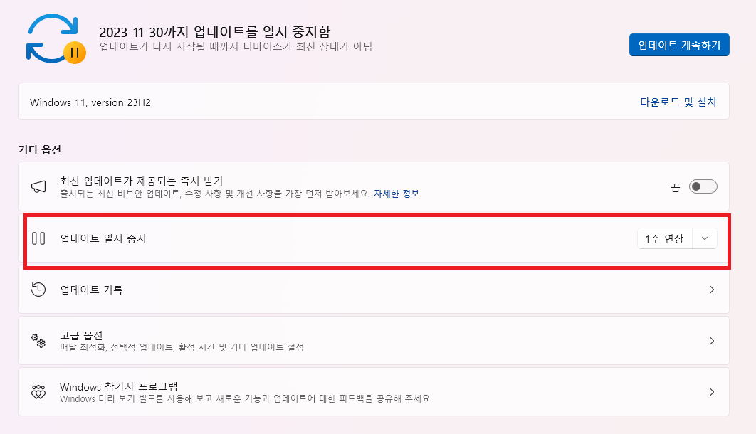 아래에 보면 업데이트 일시 중지 버튼이 있다 이걸 누르면 위 화면처럼 업데이트 일시 중지가 되면서 멈춘다.