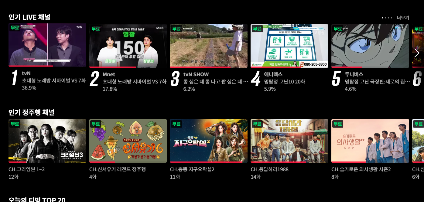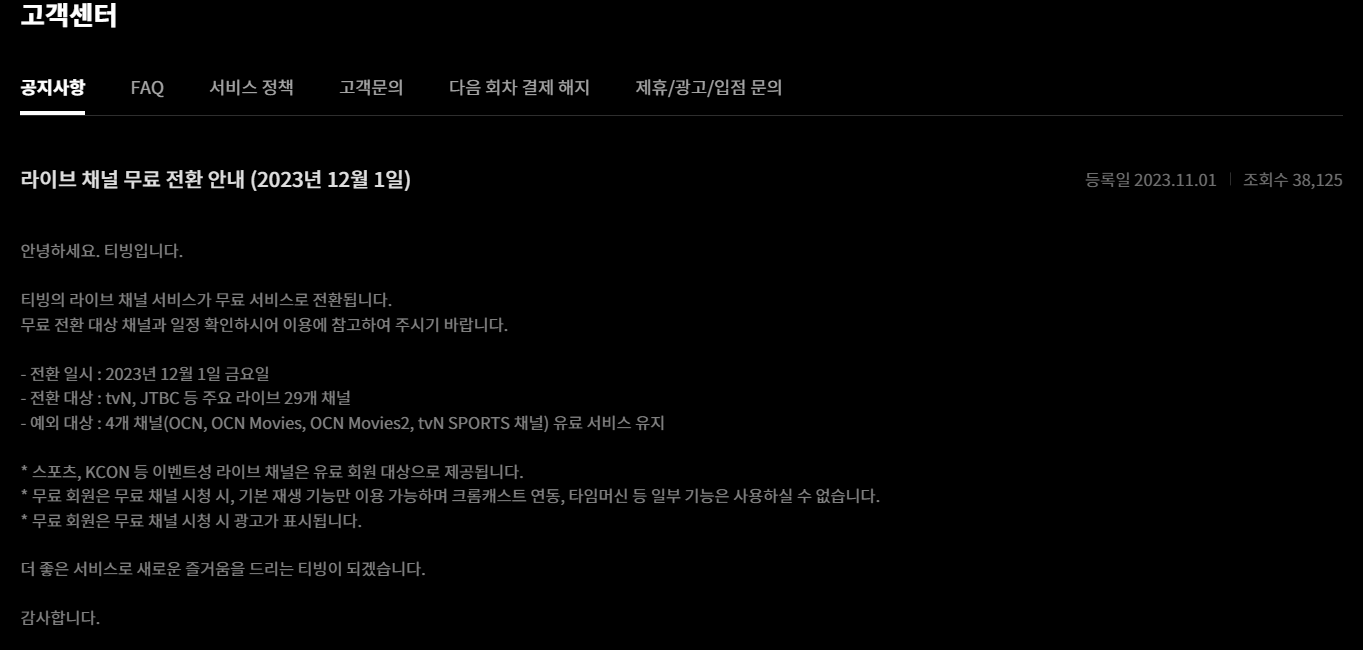 티빙이 2023년 12월 1일 부로 라이브 채널 무료 전환한다고 한다.