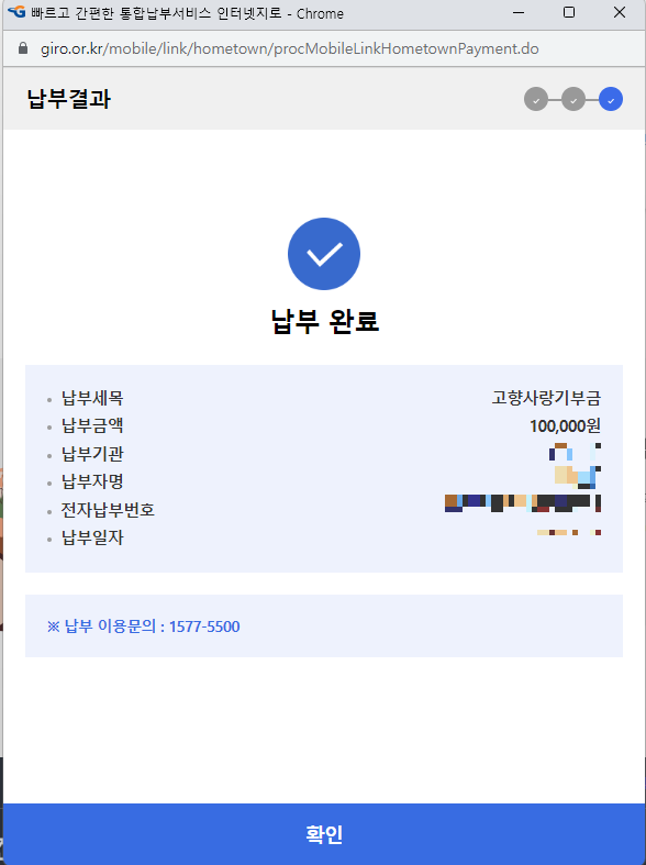 이제 기부금 납부하기 누르면 된다. 기부가 완료되면 취소가 불가능하다고 한다.