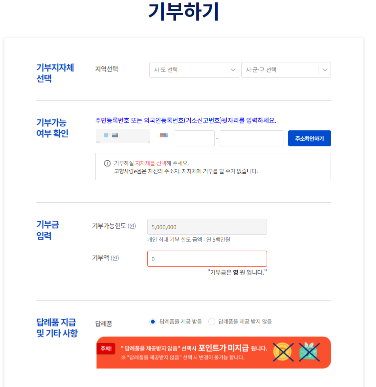 라고 적혀 있듯이 자신의 지역은 기부가 불가능하다 주민번호 뒷자리 눌러서 확인을 하자.