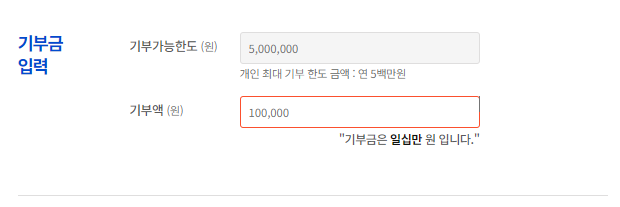 기부금은 최대 500만원이지만 100% 소득공제를 받으려면 10만원 기부해야 한다. 뭐 이상 기부해도 전혀 문제 될건 없다.