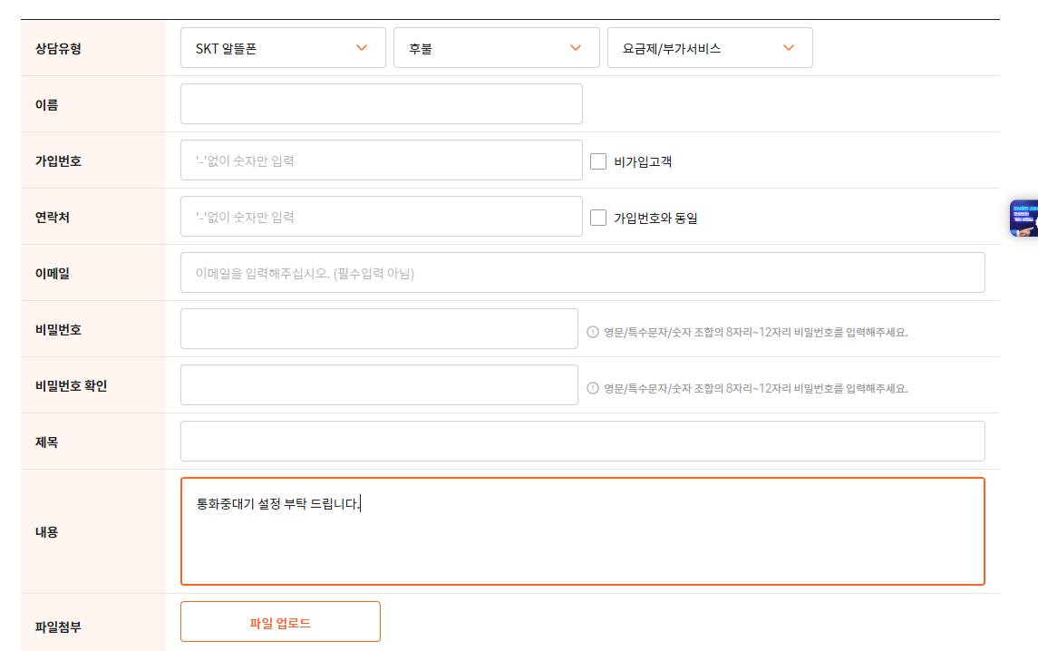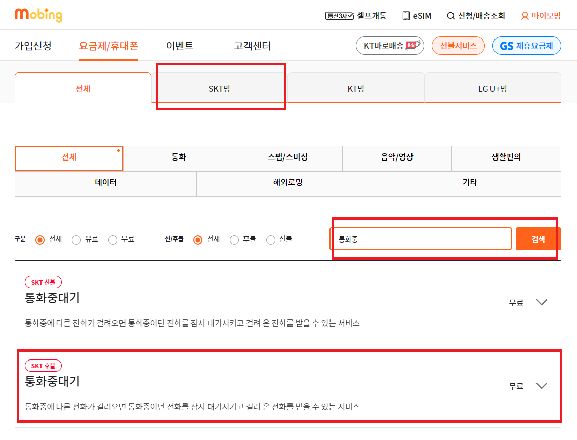모빙 SKT 알뜰폰으로 변경하고 통화중대기를 하려 했더니