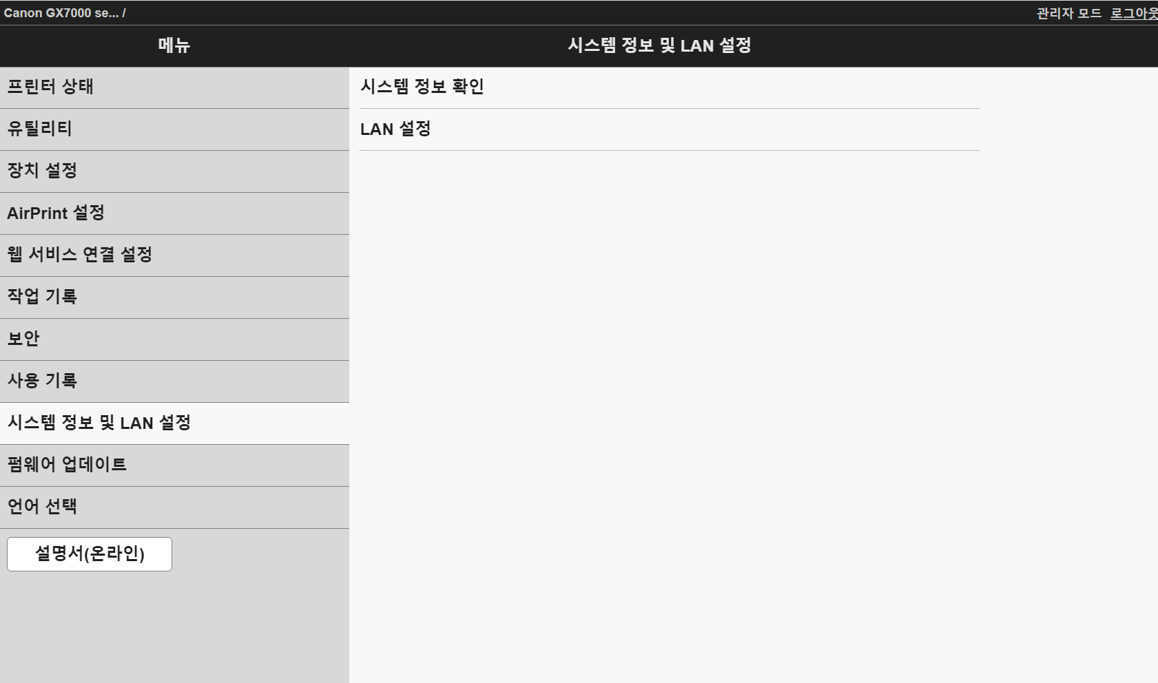 관리자 모드로 들어가자 들어간 다음에 시스템 정보 및ㅊ LAN 설정에 들어가자