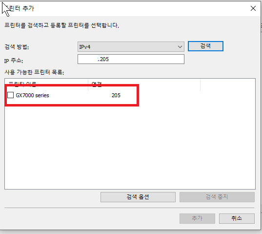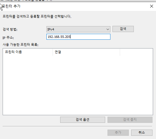 설치한 프린터 IP를 입력 하고 검색을 눌러주면