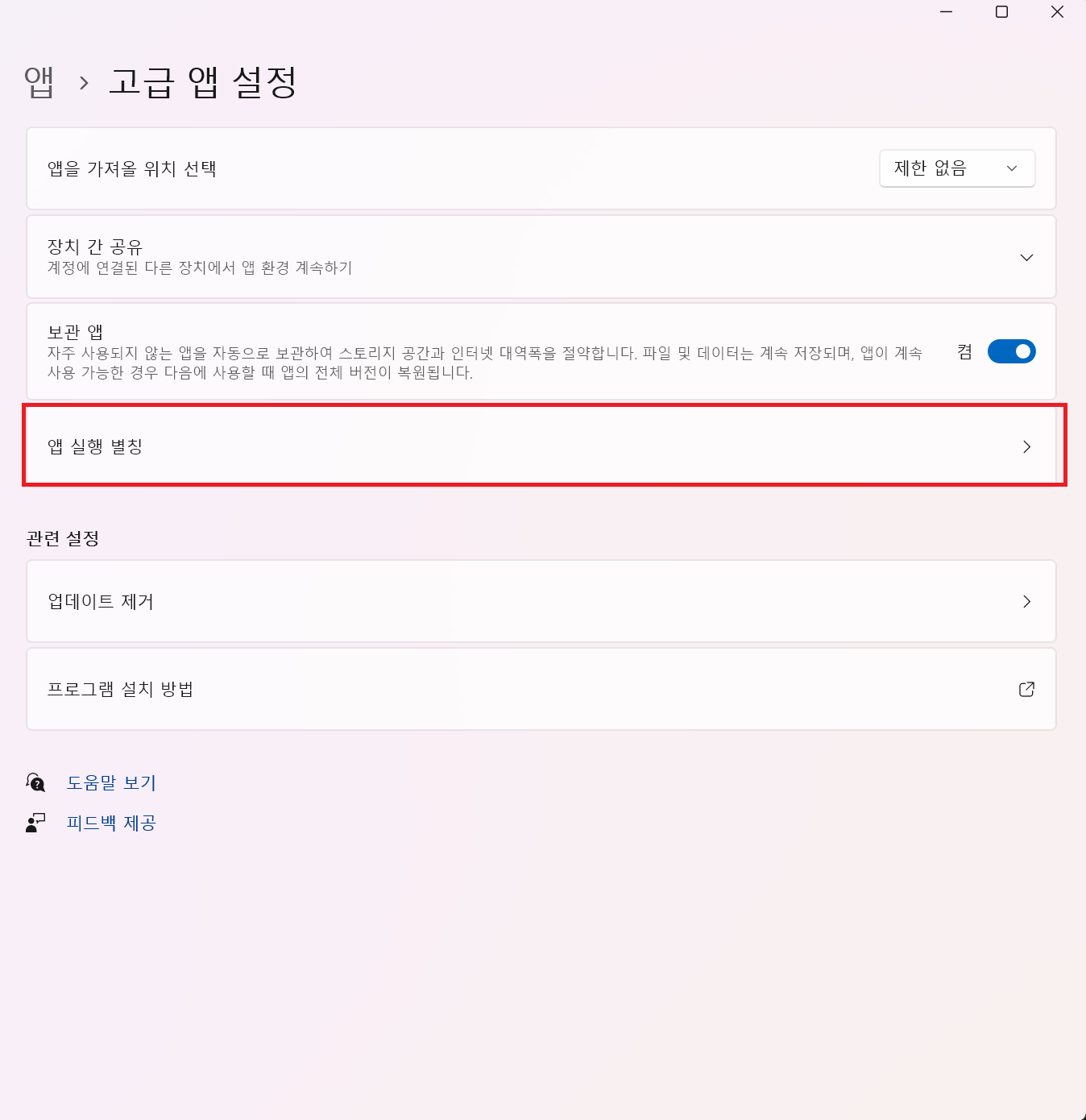 앱설정 창이 뜬다. 앱 실행 별칭을 눌러서 아래쪽 내리다보면 그림판이 있다.