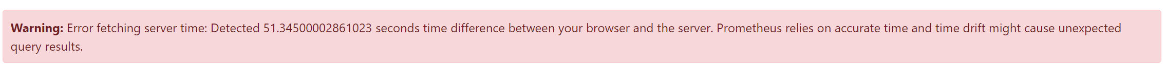 Warning: Error fetching server time: Detected 51.34500002861023 seconds time difference between your browser and the server. Prometheus relies on accurate time and time drift might cause unexpected query results.