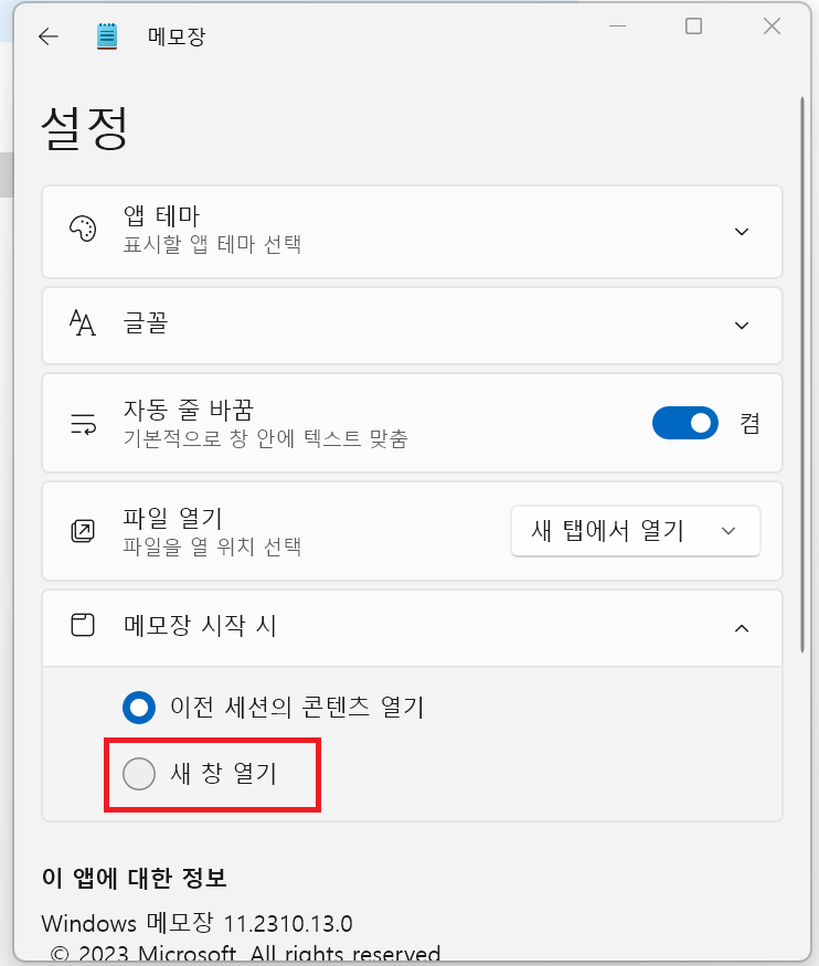 메모장 시작 시 이전 세션의 콘텐츠 열기가 아닌 새 창 열기로 선택 하면