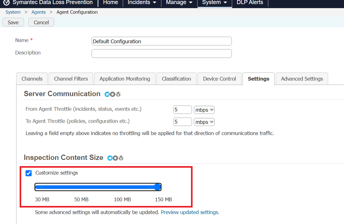 System - agents agentconfiguration 에 setting 을 보면 inspection content size 가 있다 이걸 150MB 로 올려주고