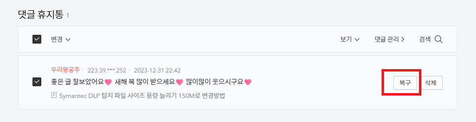 스팸 댓글 휴지통 보내기를 통해 휴지통으로 옴겨진 댓글이 있습니다.