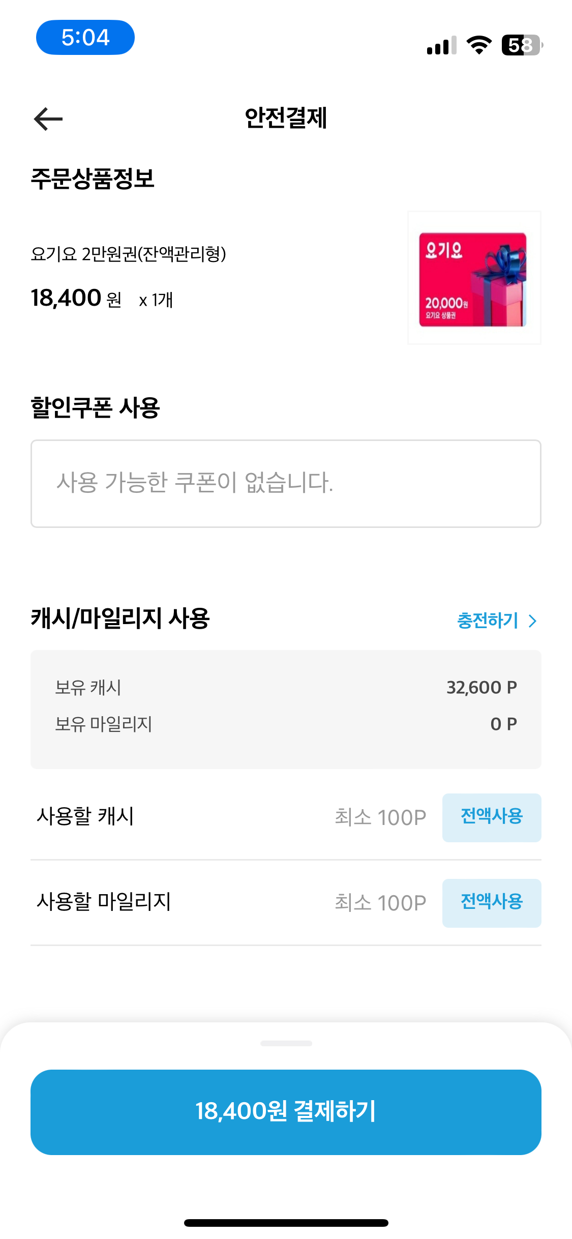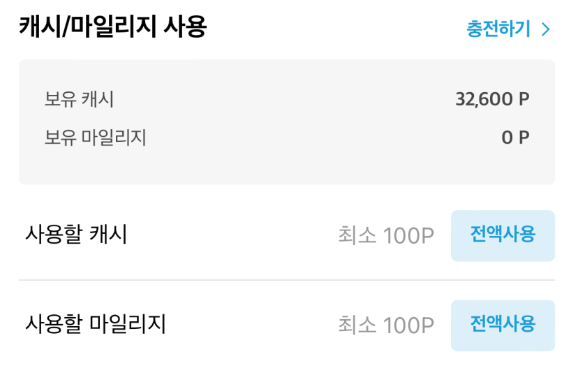 위처럼 캐시나 마일리지를 충전을 해야 한다.