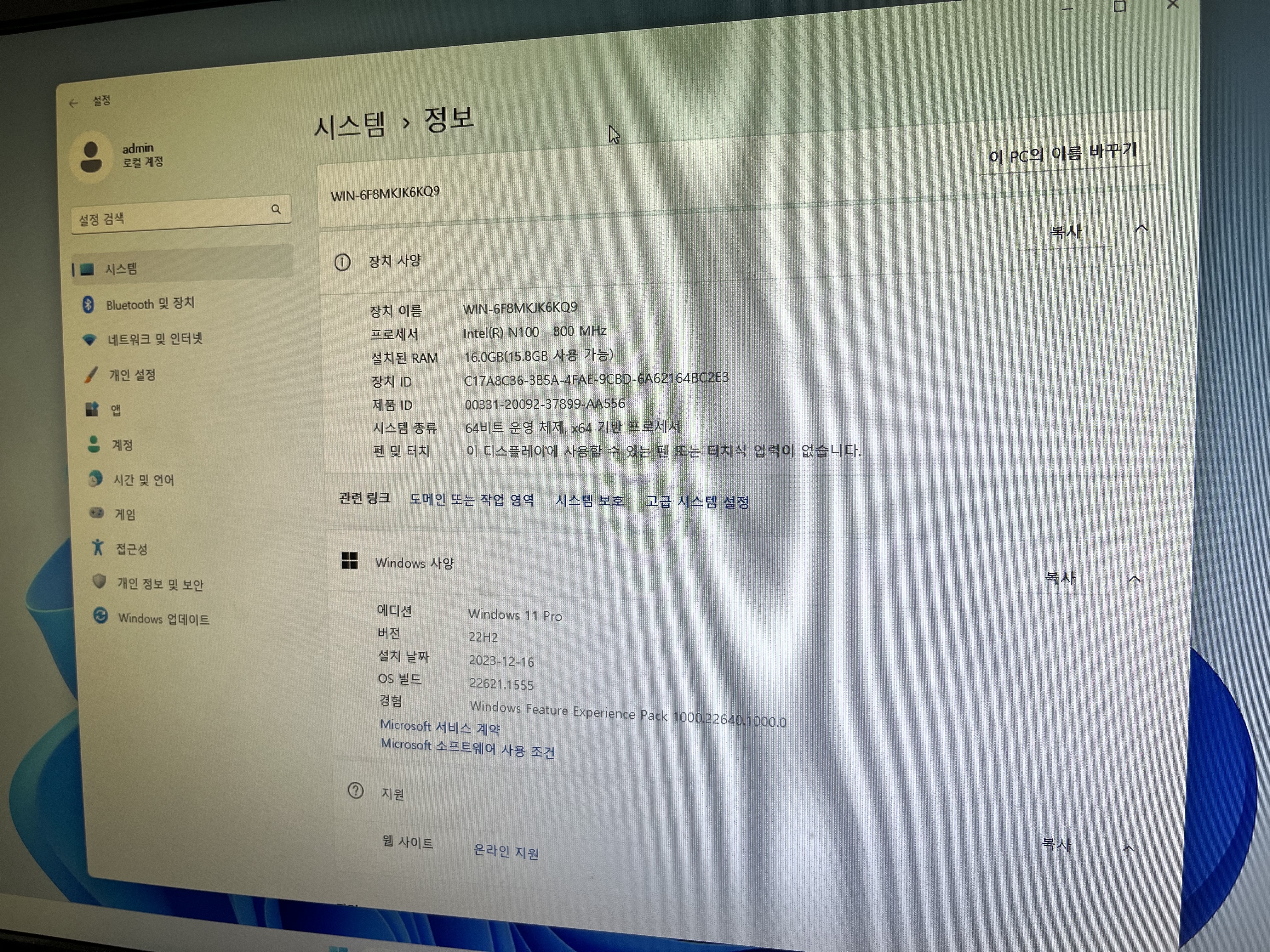 스펙은 위와 같다. 메모리는 16GB 에 하드는 512GB CPU는 아톰 N100 들어가 있다.