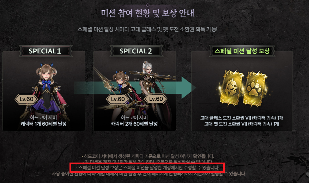 스페셜 미션 달성 보상은 스페셜 미션을 달성한 계정에서만 수령할 수 있습니다. 라고 적혀 있다.
