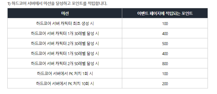 HIT2 HARD CORE 하드코어 서버 플레이 포인트 이벤트 하드코어 서버에서 특정 미션을 달성하시면 플레이 포인트를 획득하실 수 있습니다. 누적 획득한 플레이 포인트를 하드코어 서버 종료 이후 특